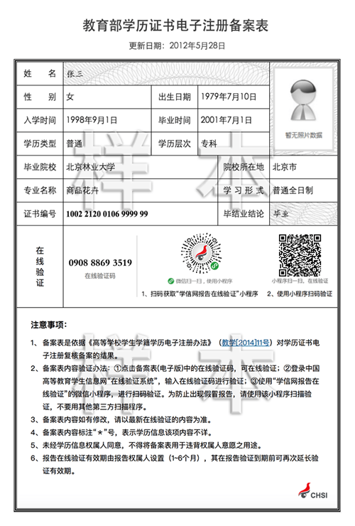 教育部学历证书电子注册备案表(样本)