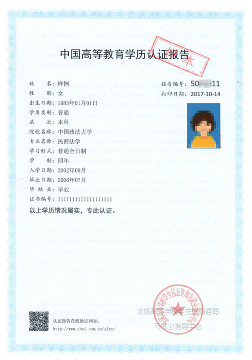 中国高等教育学历认证报告(样本)