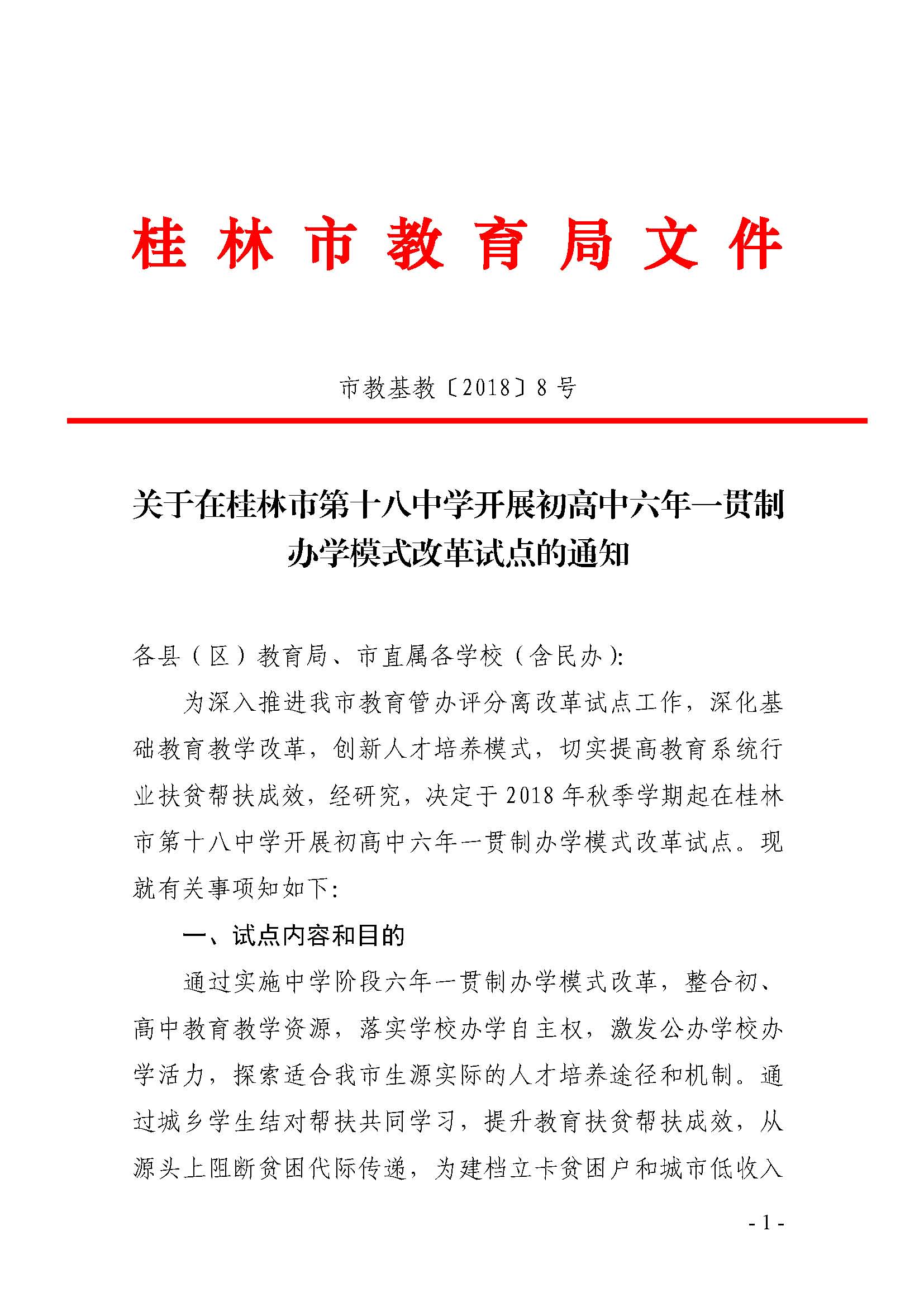 关于在桂林市第十八中学开展初高中六年一贯制办学模式改革试点的通知_页面_1