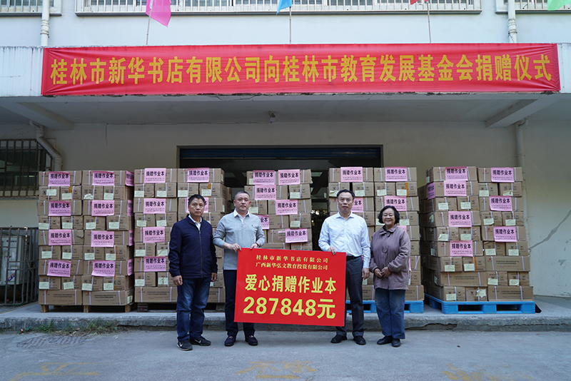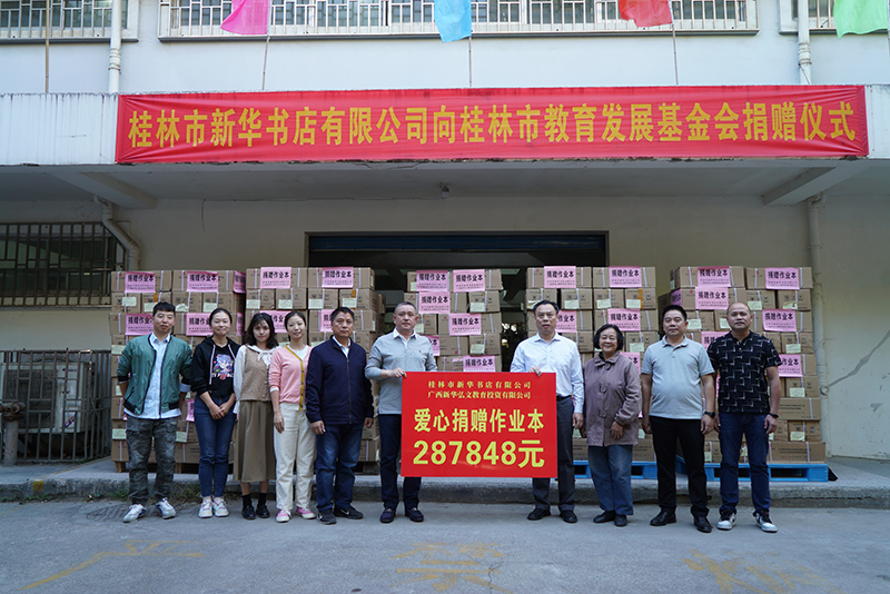 10月13日,桂林市新华书店有限公司举行捐赠仪式,向桂林市教育发展基金会捐赠一批标准化环保作业本合计15.5万册,共价值28.78万元。