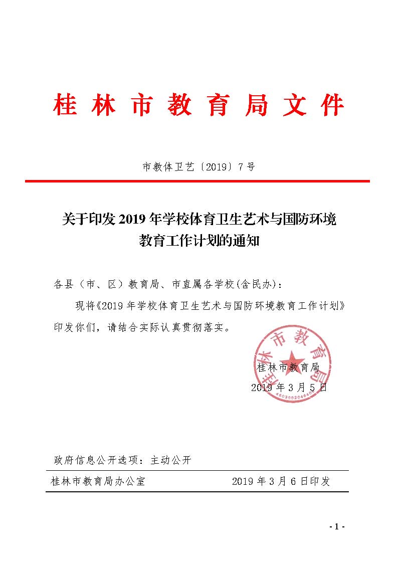 关于印发2019年桂林市学校体育卫生艺术与国防环境教育工作计划的通知_页面_01