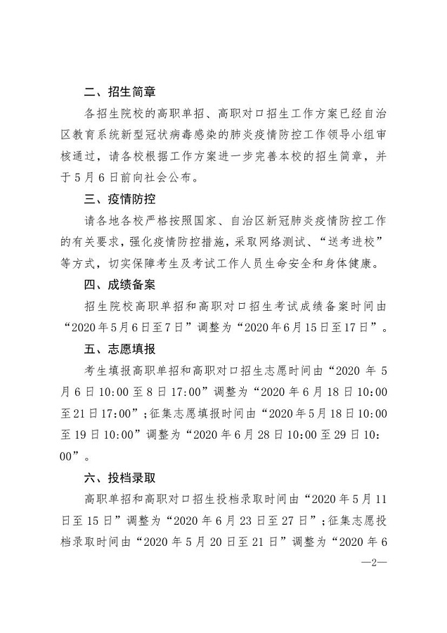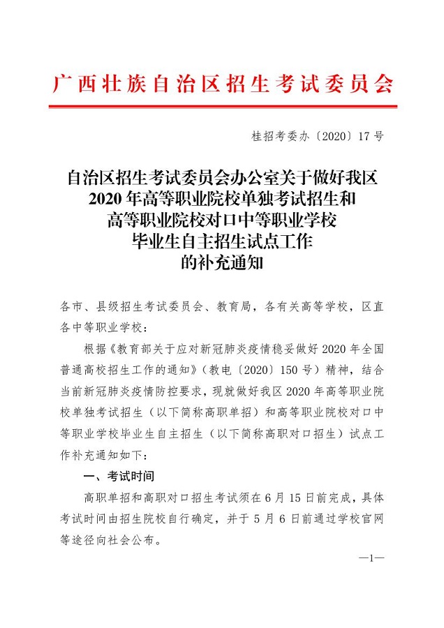 (桂招考委办〔2020〕17号)自治区招生考试委员会办公室关于做好我区2020年高等职业院校单独考试招生和高等职业院校对口中等职业学校毕业生自主招生试点工作的补充通知