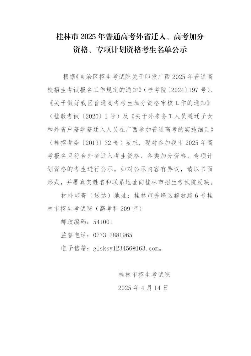 桂林市2025年普通高考外省迁入、高考加分资格、专项计划资格考生名单公示