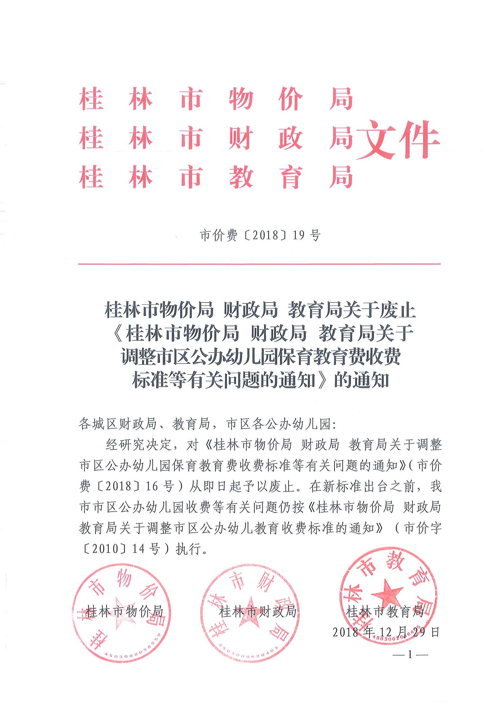 关于废止《桂林市物价局 财政局 教育局关于调整市区公幼儿园保育教育费收费标准等有关问题的通知》的通知_页面_1