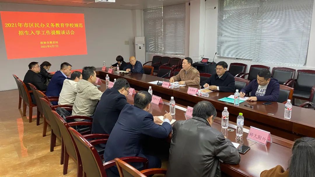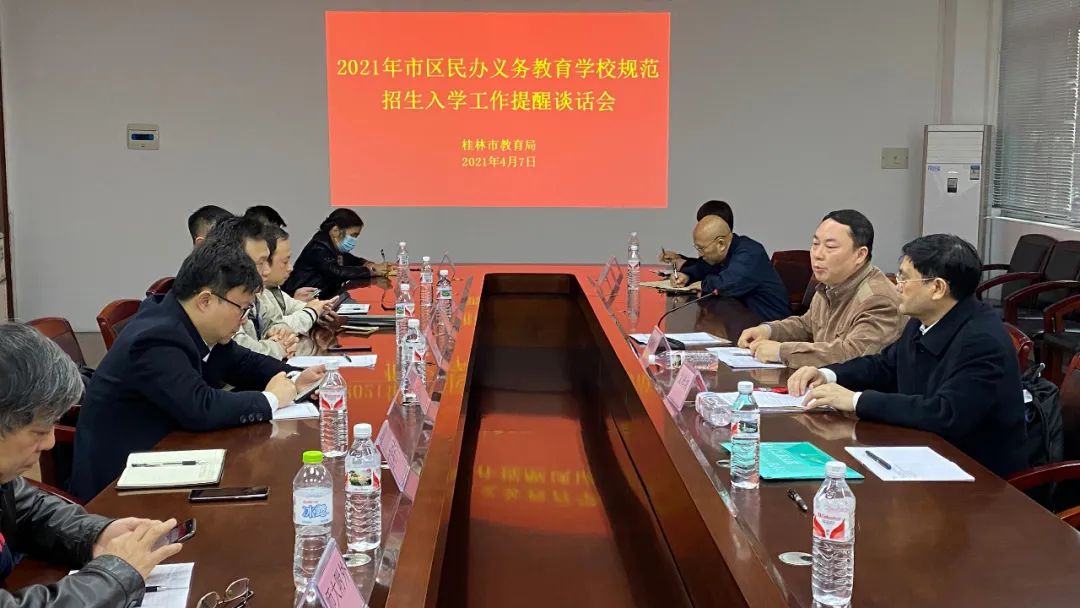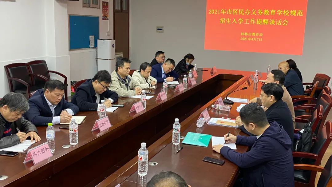 为进一步规范我市中小学招生入学行为,督促各民办学校严格落实国家、自治区和桂林市相关政策文件精神,自觉遵守、执行教育部关于中小学招生入学“十项严禁”纪律要求,共同营造风清气正育人环境,4月7日,桂林市教育局召开2021年市区民办义务教育学校规范招生入学工作提醒谈话会,市直属各民办学校校长参加了会议。