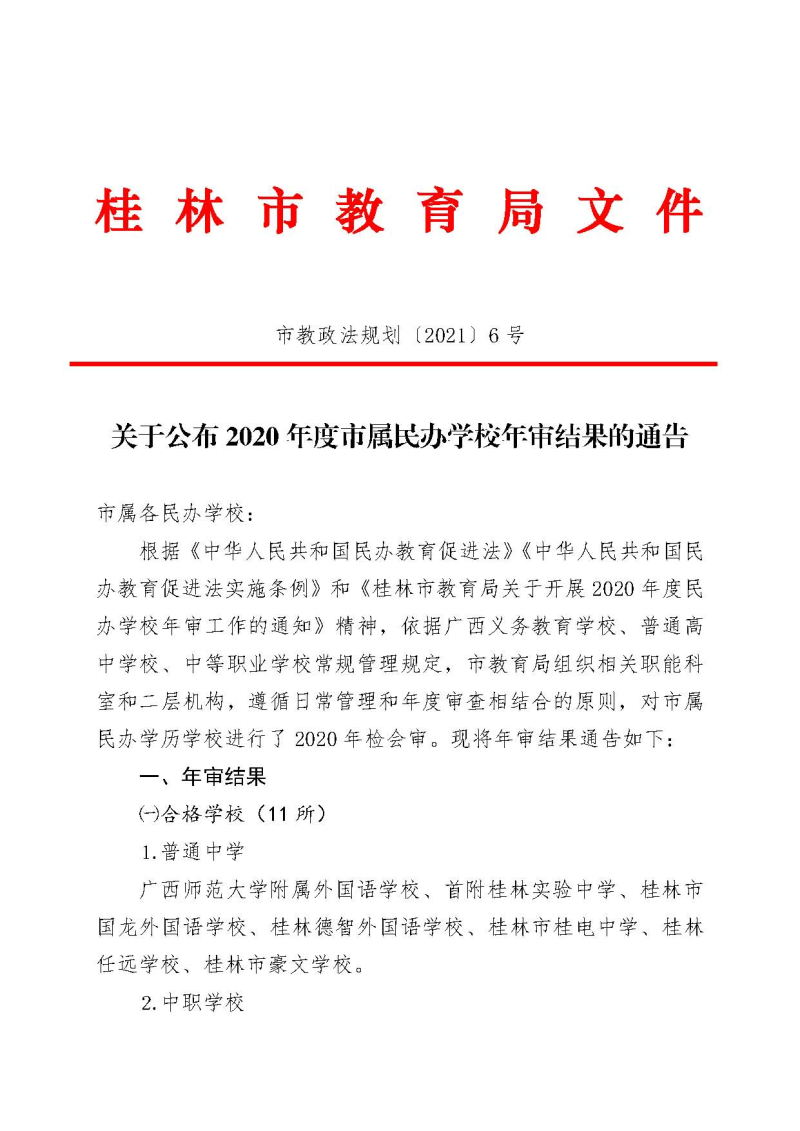 关于公布2020年度市属民办学校年审结果的通告