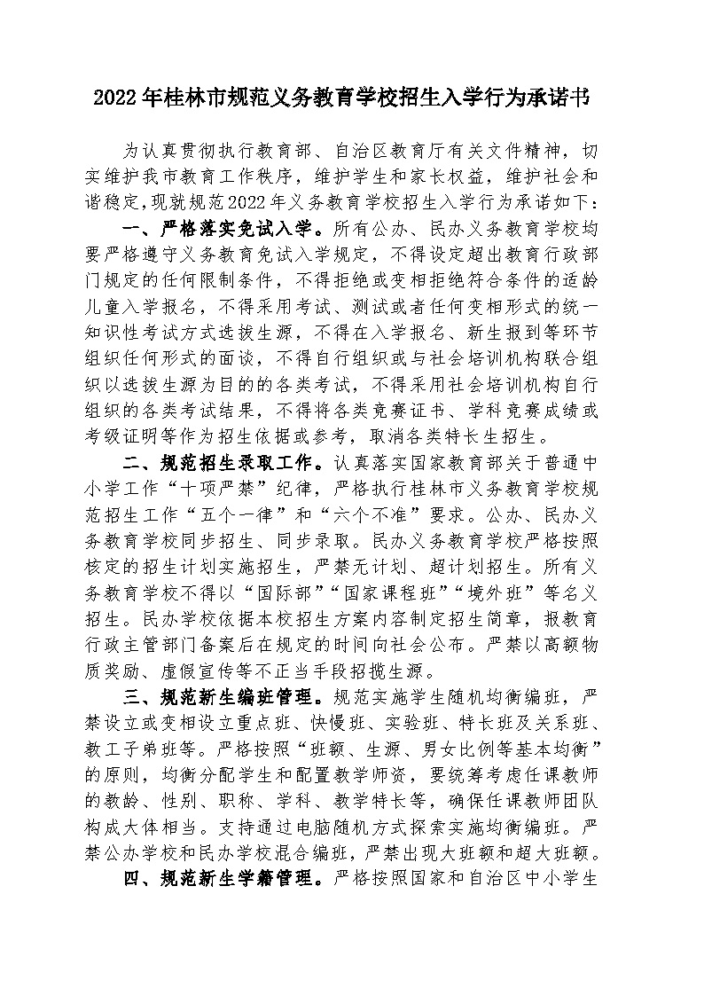 2022年桂林市规范义务教育学校招生入学行为承诺书
