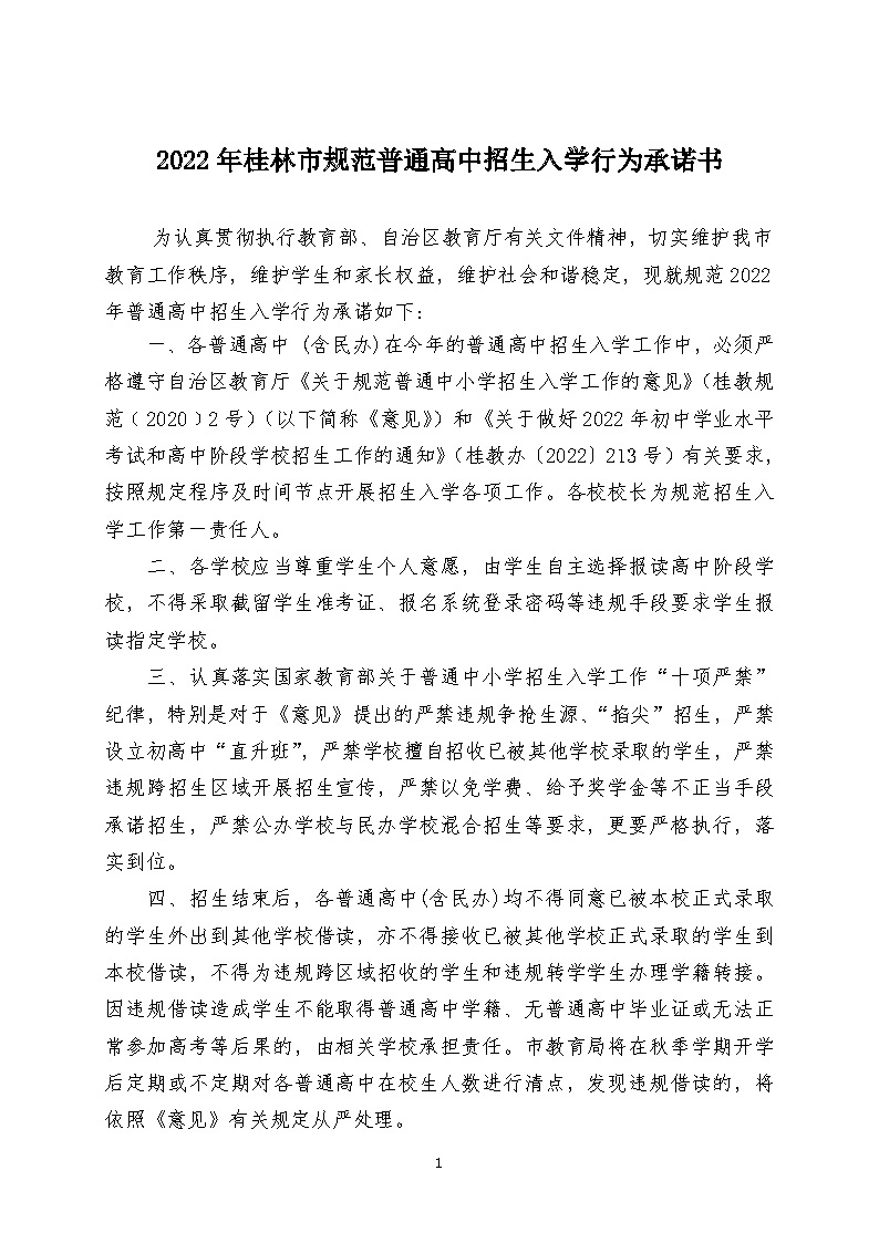 2022年桂林市规范普通高中招生入学行为承诺书