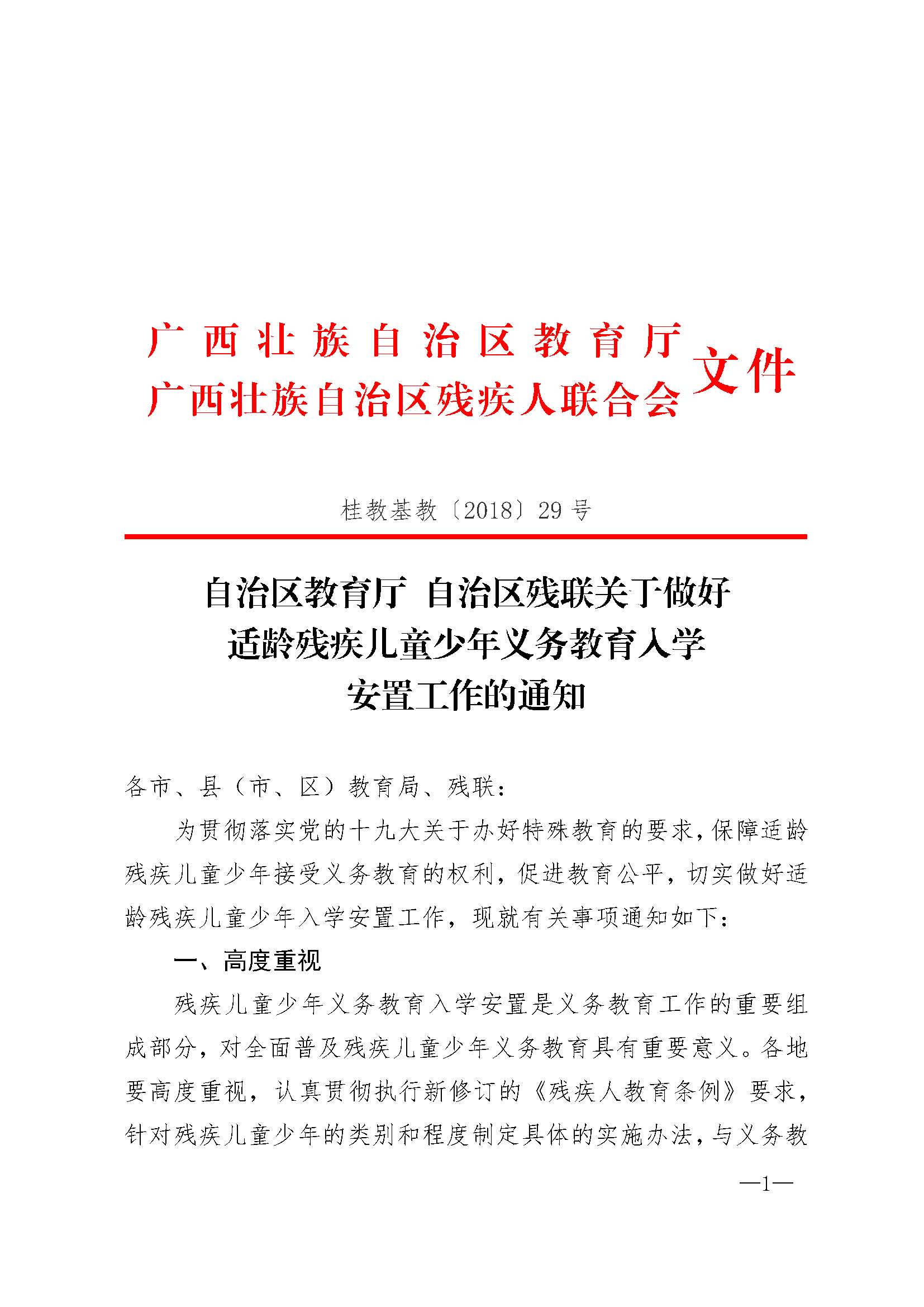 桂教基教〔2018〕29号自治区教育厅 自治区残联关于做好适龄残疾儿童少年义务教育入学安置工作的通知_页面_1