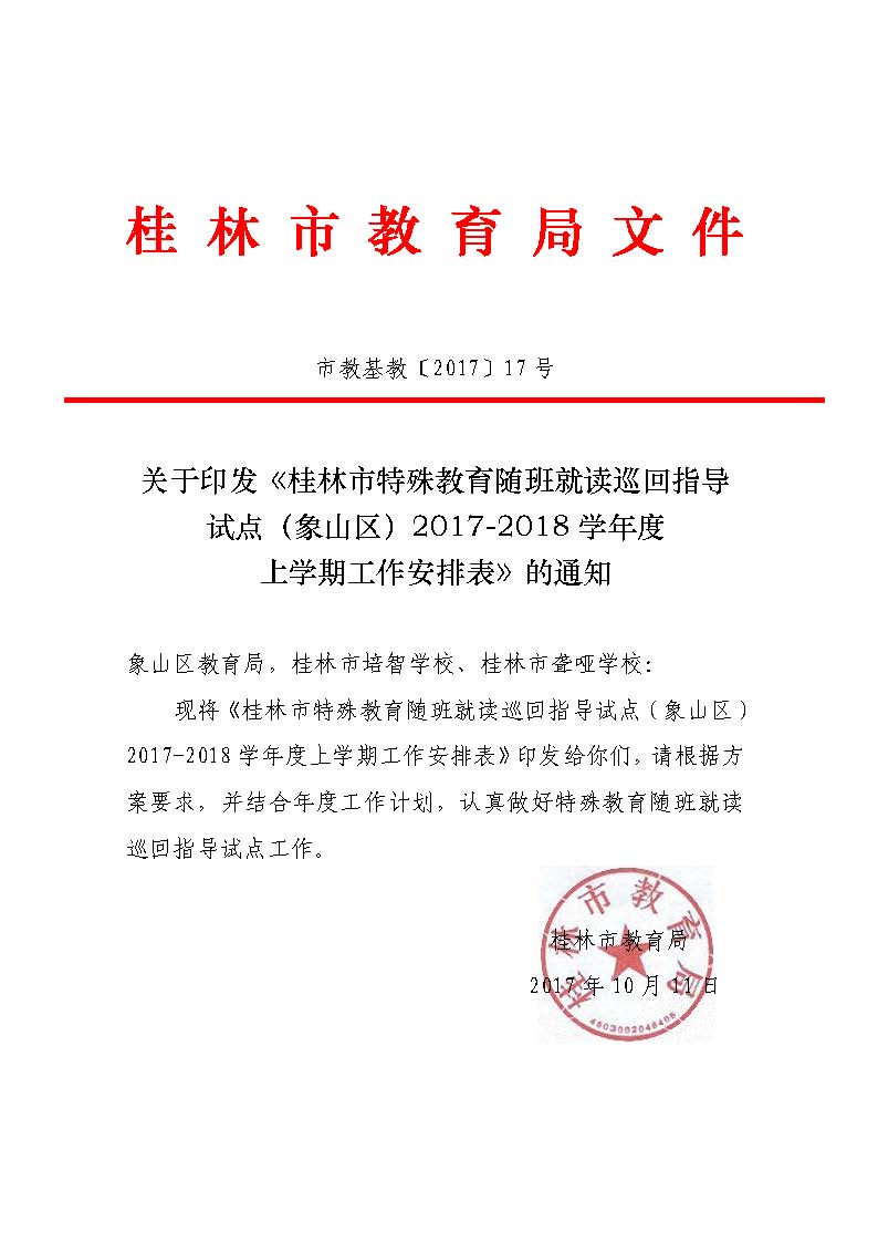 关于印发《桂林市特殊教育随班就读巡回指导试点(象山区)2017-2018学年度上学期工作安排表》的通知