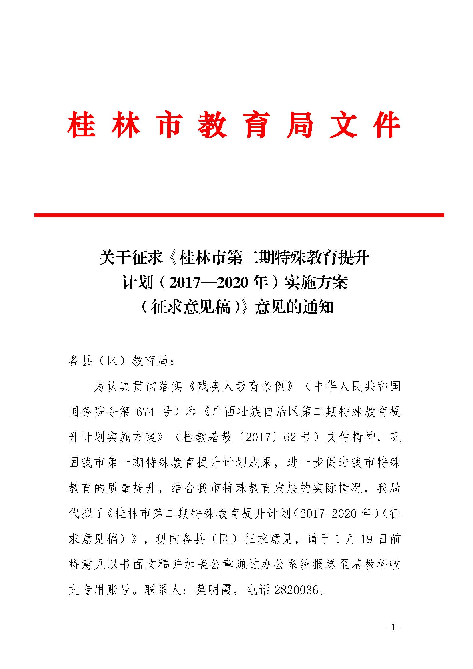 关于征求《桂林市第二期特殊教育提升计划(2017—2020年)实施方案(征求意见稿)》意见的通知