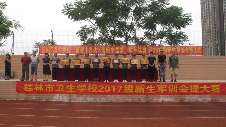 2017年9月2日上午,桂林市卫生学校2017级新生军训会操大比武暨“喜迎十九大·唱响中国梦”歌咏比赛分别在两校区操场举行。