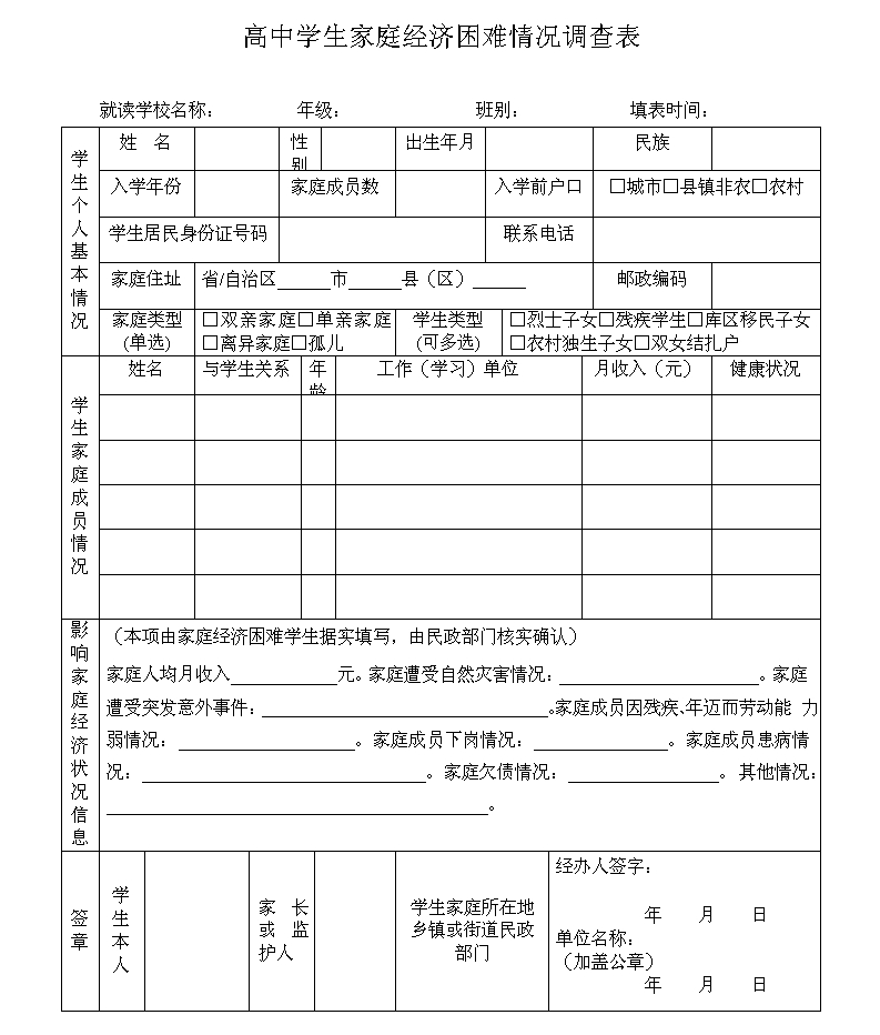 高中学生家庭经济困难情况调查表