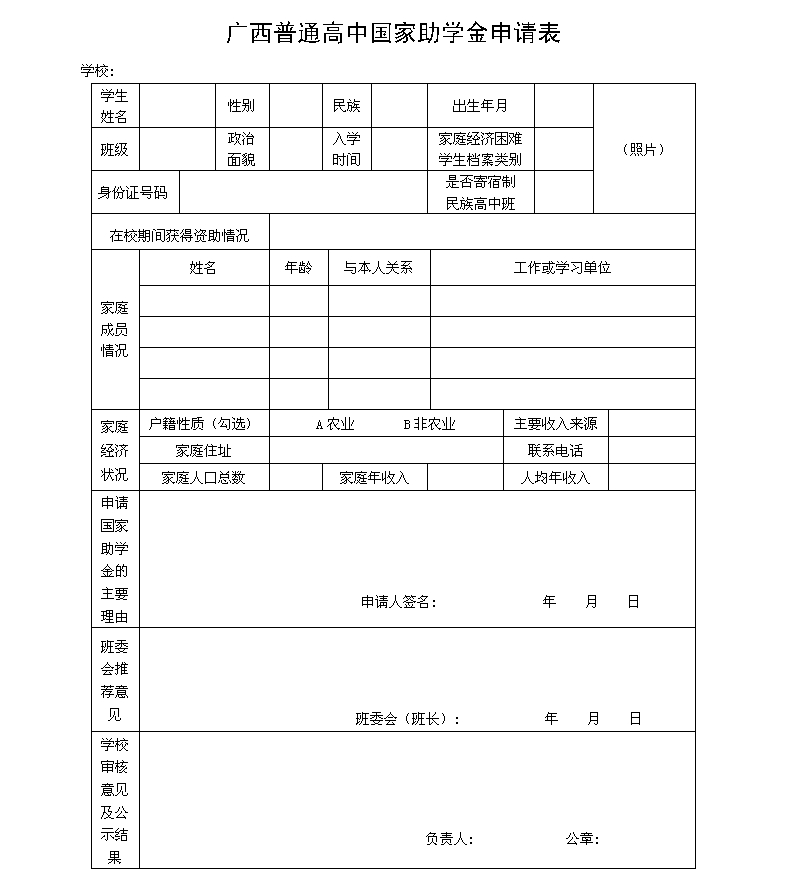 广西普通高中国家助学金申请表