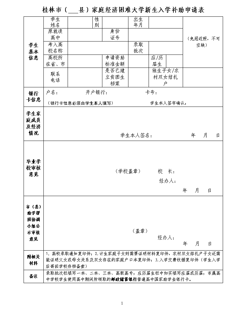 桂林市( 县)家庭经济困难大学新生入学补助申请表