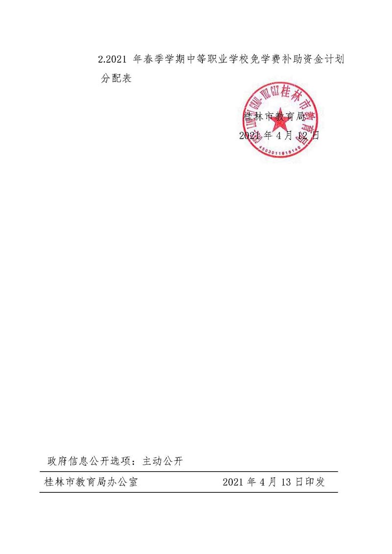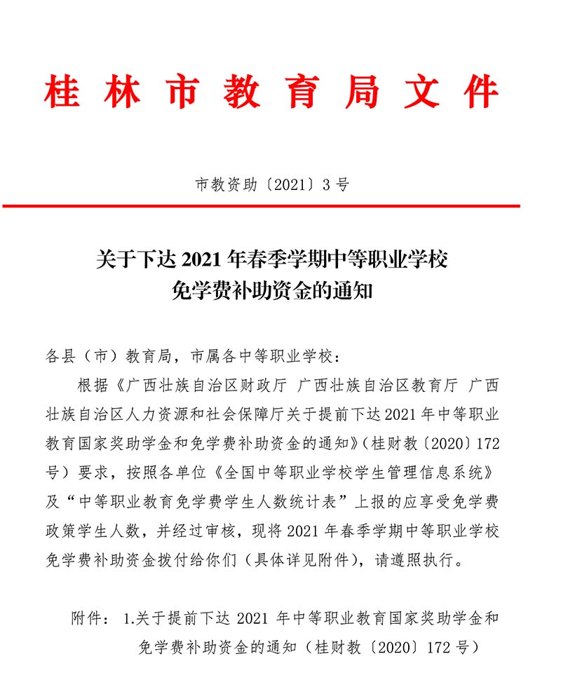 市教资助〔2021〕3号关于下达2021年春季学期中等职业学校免学费补助资金的通知