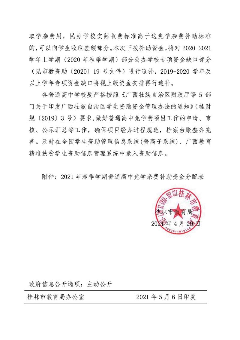 市教资助〔2021〕7号关于下达 2021年春季学期普通高中免学杂费补助资金的通知