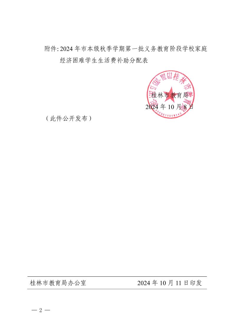 桂林市教育局关于下达市本级2024年秋季学期第一批义务教育阶段学校家庭经济困难学生生活费补助的通知