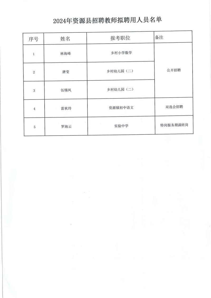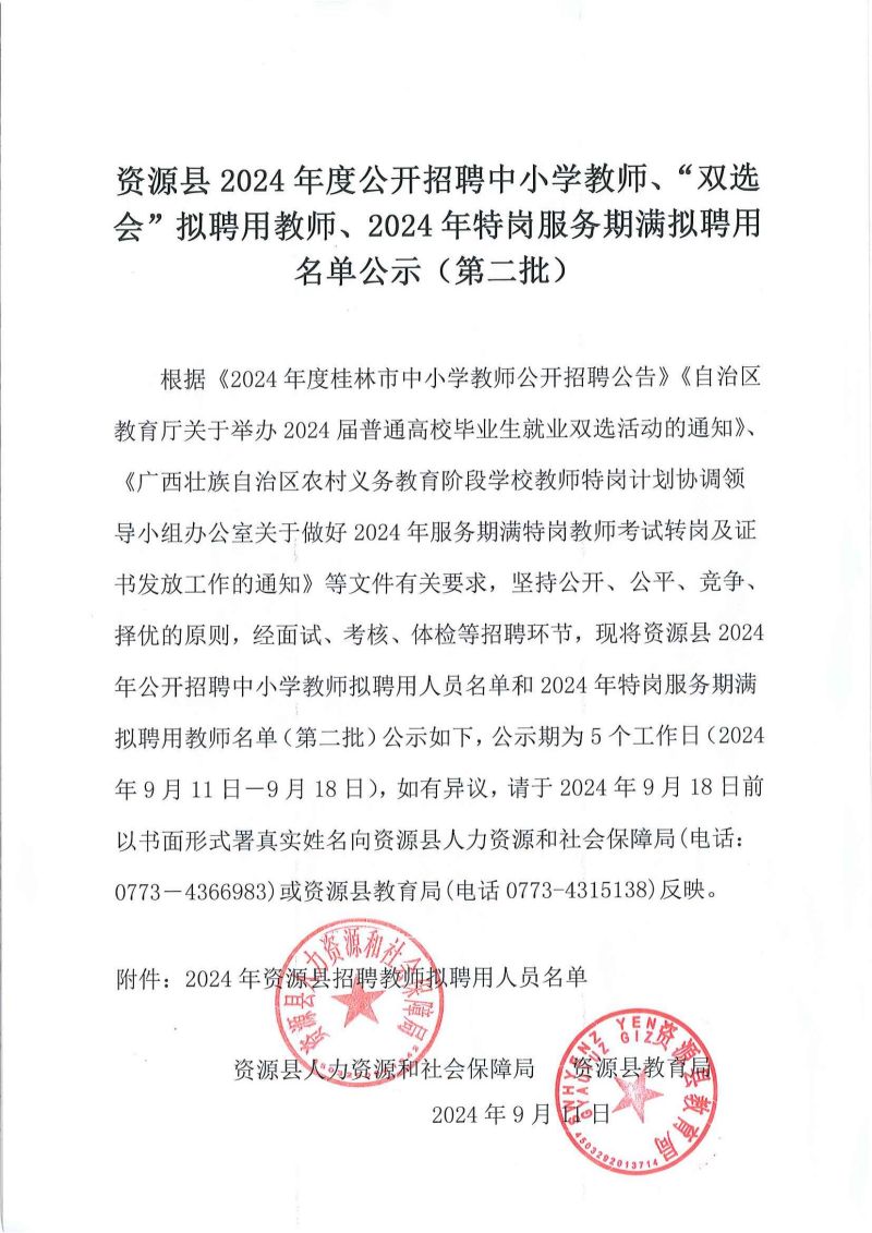 资源县2024年度公开招聘中小学教师、“双选会”拟聘用教师、2024年特岗服务期满拟聘用名单公示(第二批)