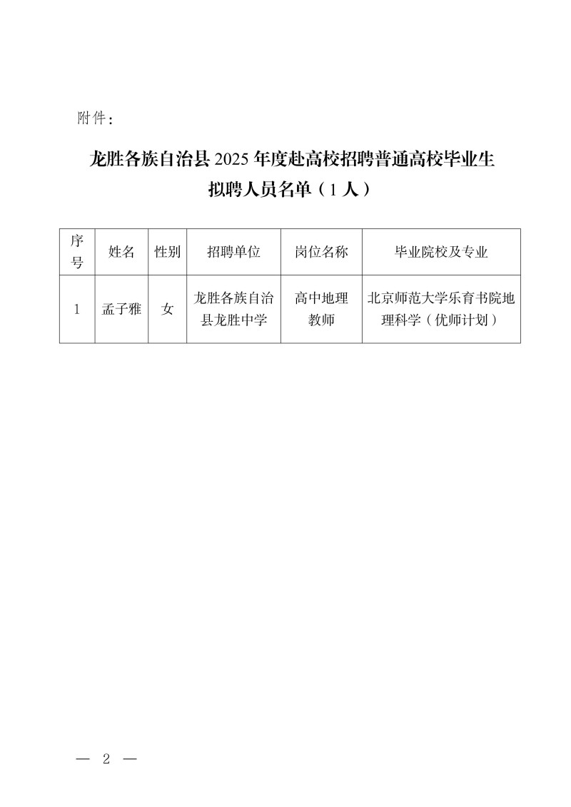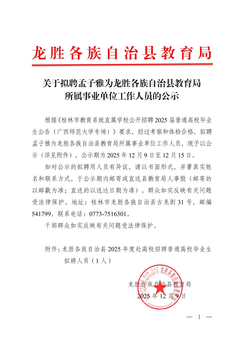 关于拟聘孟子雅为龙胜各族自治县教育局所属事业单位工作人员的公示