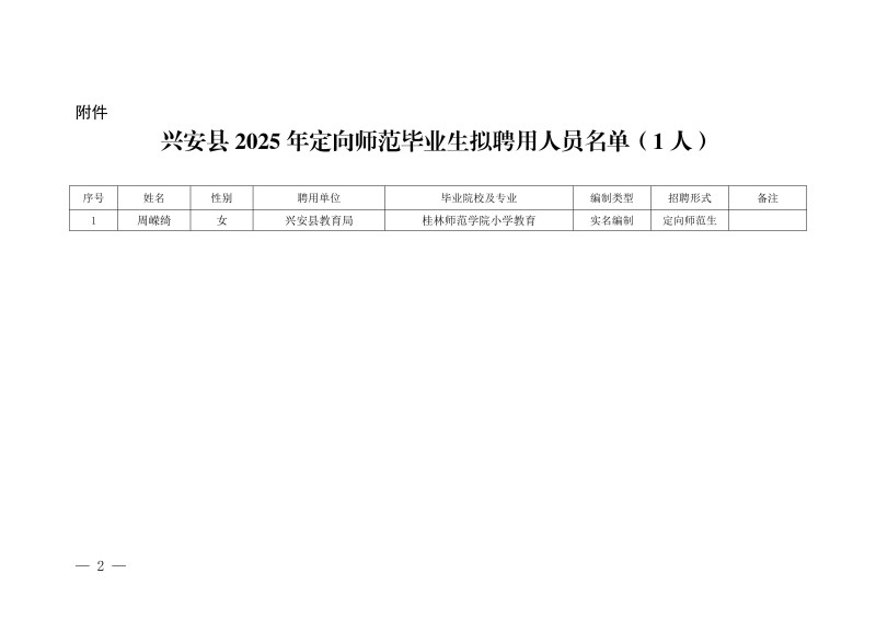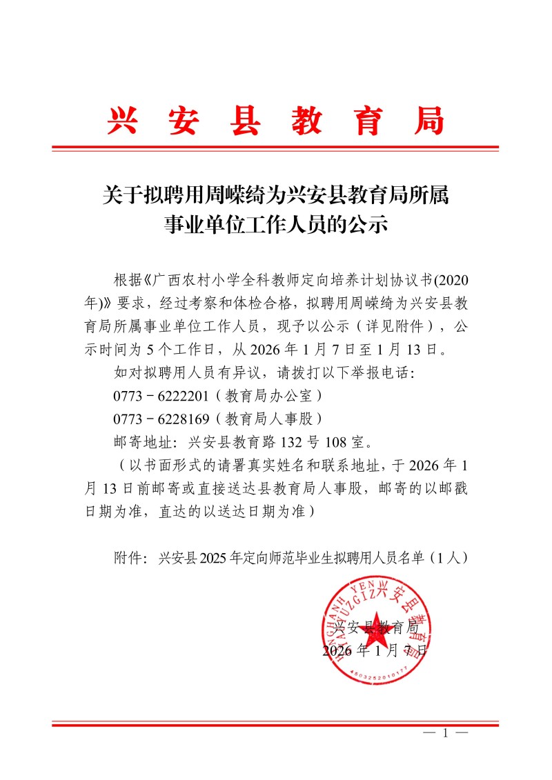 关于拟聘用周嵘绮为兴安县教育局所属事业单位工作人员的公示