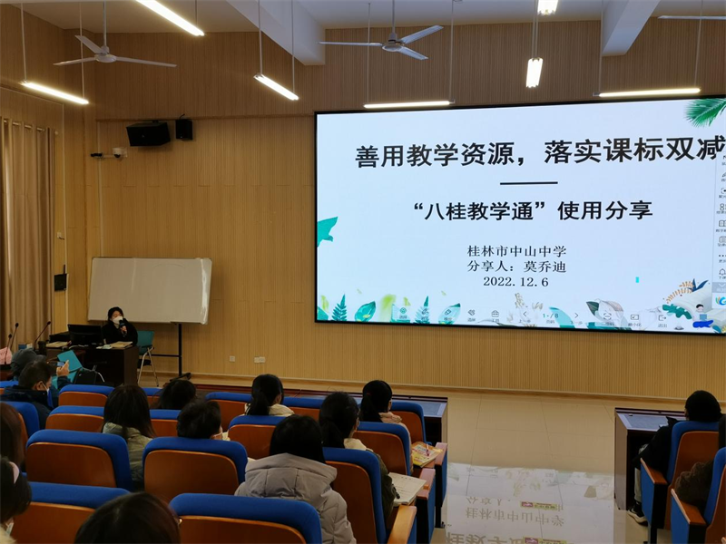 12月6日,桂林市中山中学教务处组织开展“八桂教学通”使用推广分享活动,活动由邱醒嵘老师主持,分管初中部副校长唐小华、教学副校长蔡祺琪、德育副校长张驰以及全体初中部行政、教师参加此次活动。