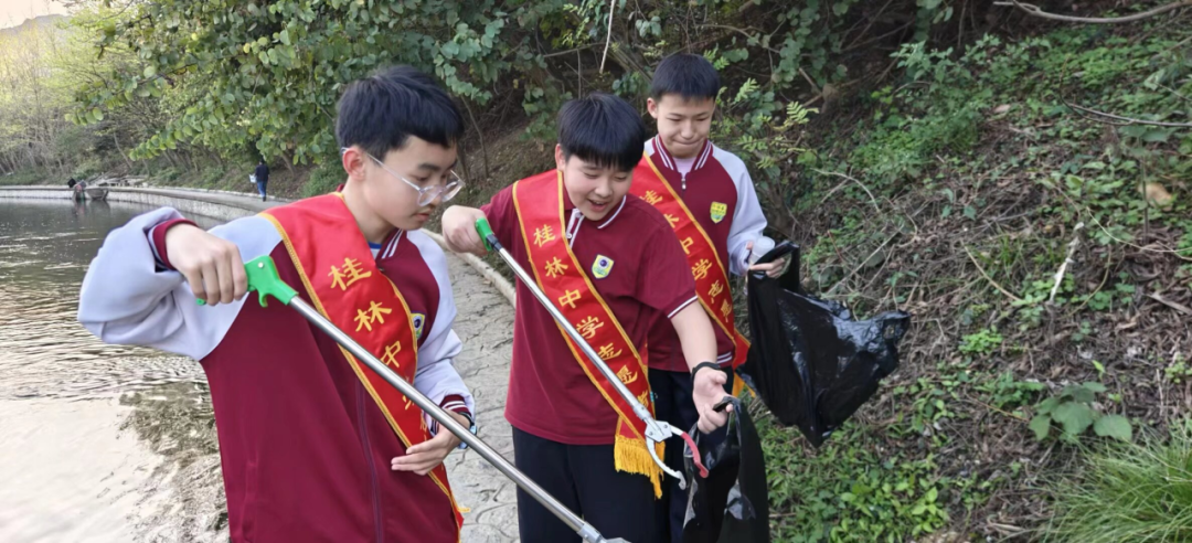 桂林中学“锋”火少年志愿服务队响应“美丽中国,青春行动”的号召,开展护河环保志愿服务活动,以青春行动践行生态文明理念,守护家乡绿水青山。队员们手持清洁工具,沿河岸认真清理垃圾,在劳动中体验“互助、进步”的志愿精神,将建设美丽中国的青春志向,书写在躬身实践的每一步之中。