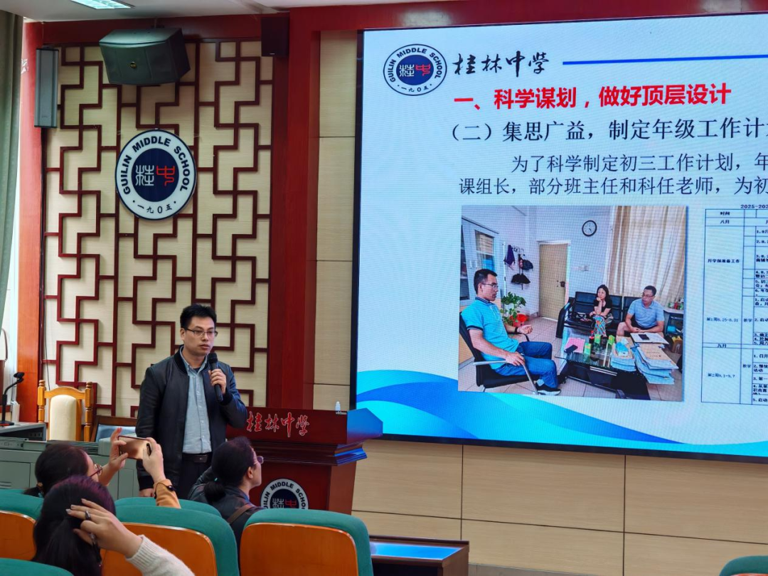 当天,桂林市桂林中学还开展了“初三年级管理与备考”主题讲座,主讲教师结合学校初三年级教学管理经验与中考备考实践,从班级管理策略、备考计划制订、学生心理疏导、学科复习技巧等方面展开分享,为贺州市实验中学的初三备考工作提供了参考。