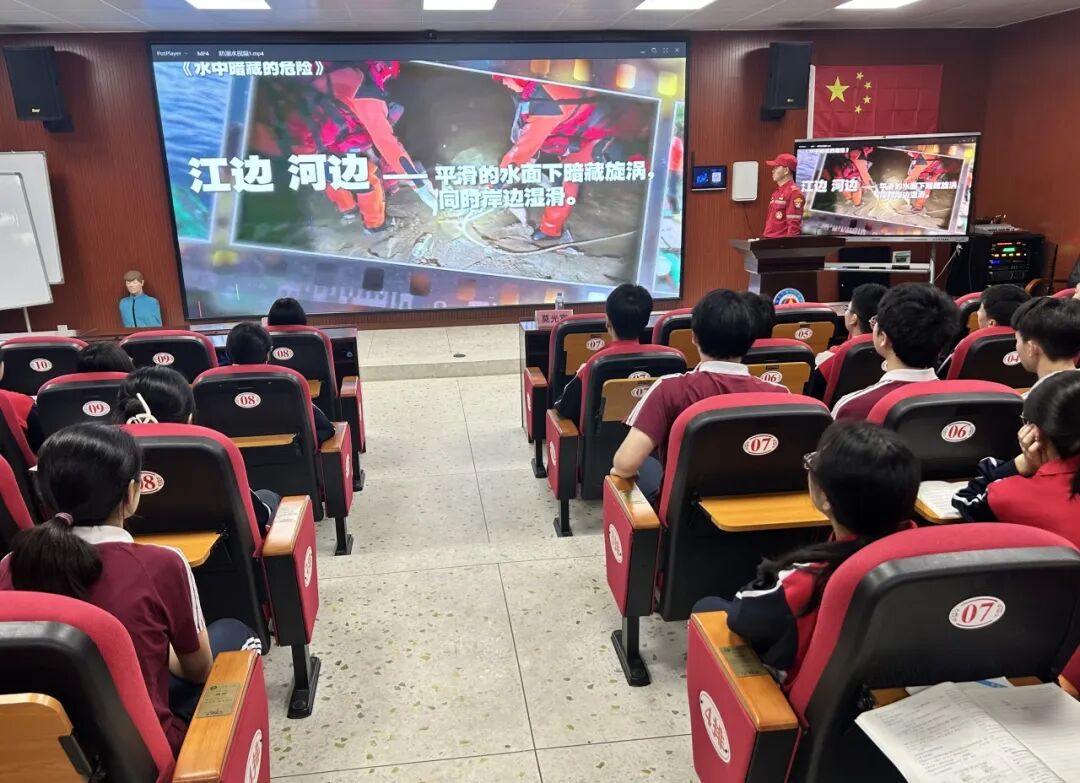 讲座中,学校相关负责人表示夏季是溺水事故高发期,希望学生时刻绷紧安全之弦,远离危险水域,同时呼吁班主任与社区协同发力,形成家校社联动的防护网络。桂林漓江水上搜救志愿者服务中心主讲人结合漓江流域实际情况,详细讲解溺水事故的高发场景与常见原因,提醒同学们警惕野外危险水域的安全隐患,强调私自下水、结伴戏水等行为的巨大风险。现场还播放了防溺水警示教育视频,通过真实案例让同学们直观感受溺水事故的危害。主讲人结合自身参与上百次水下搜救的经历,以鲜活案例敲响安全警钟,引导大家敬畏生命、远离危险。