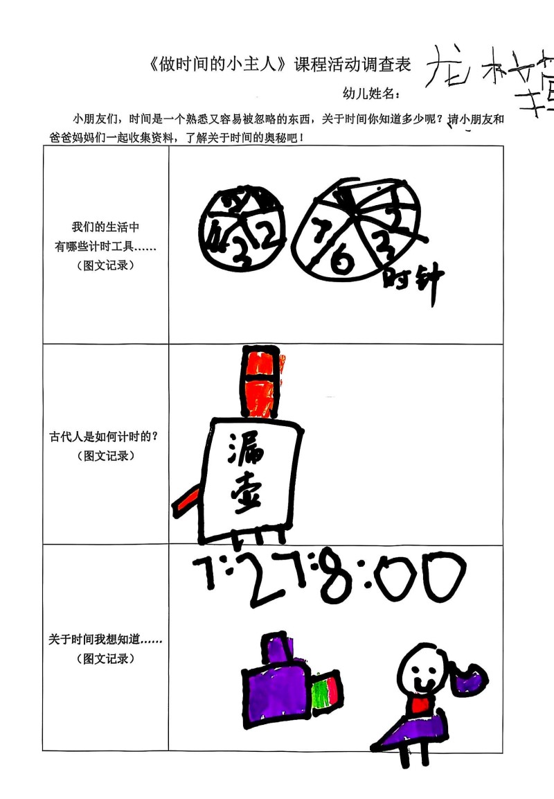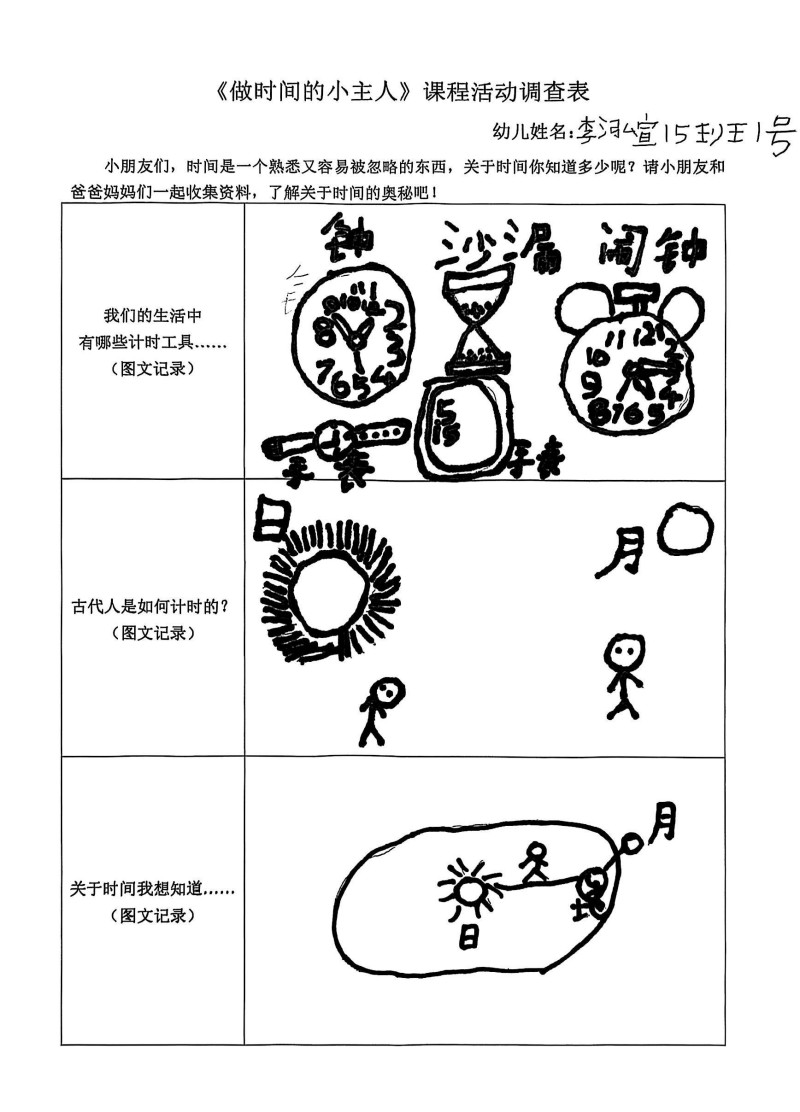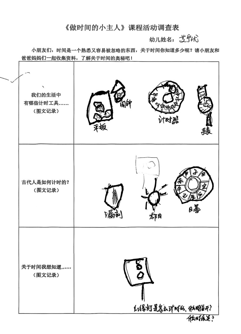 通过对时间话题的初步讨论,“时间大调查”亲子任务便点燃了孩子们的探索热情。班级邀请家长与孩子共同参与,通过查阅书籍、浏览科普视频等方式收集资料,携手完成《做时间的小主人》课程活动调查表。孩子和家长们不仅详细记录日晷、沙漏等古代计时工具的工作原理,还标注闹钟、智能手表、手机等现代计时工具的使用场景,并认真写下孩子们关于时间的种种疑问,如“一分钟有多长?”、“时钟怎么看?”、“时间是怎么过去的?”等。