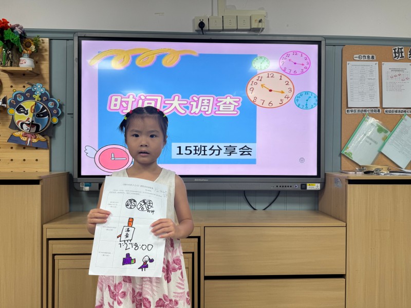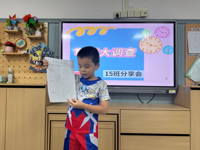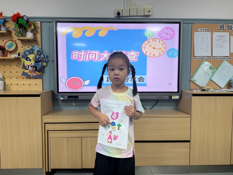 在随后的分享课上,孩子们化身“小小探索家”踊跃举手,都想上前展示自己的调查成果:有的孩子拿着画着日晷的调查表介绍,“我和爸爸查了,日晷上的指针对着太阳,影子落在哪个数字上就是几点”;有的孩子说了自己家的智能手表,“它不仅能看时间,还能提醒我该睡觉了”;还有的孩子皱着小眉头提出了自己的疑问,“老师,红绿灯是怎么计时的呀?”稚嫩的话语里满是发现的喜悦与探索的好奇。