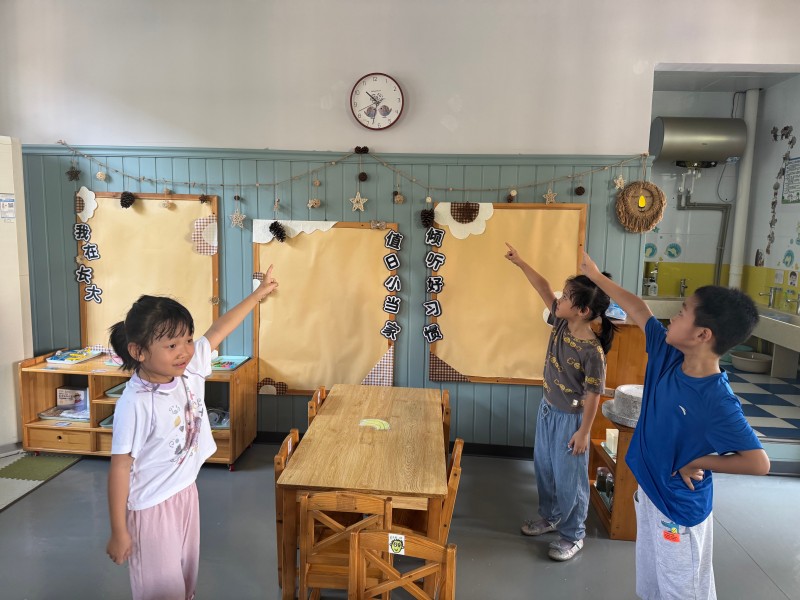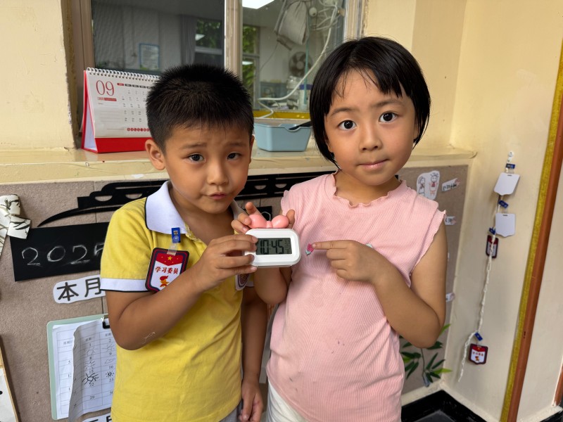 老师的话:幼儿园教育倡导“生活即教育”,面对“时间”这样抽象的概念,教师没有机械灌输,而是通过亲子调查与实践寻找,让孩子在体验中建立认知,这份成长格外动人。“时间大调查”里,家长的陪伴让探索充满温度,孩子们手绘日晷、记录智能手表功能,连“红绿灯怎么计时”的疑问都透着灵气;分享课上,孩子们自信表达,那份主动求知的模样,是家园共育最珍贵的成果。随后的“找时间”活动,更让抽象的时间变得可触可感,皮亚杰的认知发展理论告诉大家,幼儿的思维具有具体形象性,他们需要通过亲身体验来建构认知。从教室的时钟到街道的红绿灯倒计时,孩子们渐渐发现时间藏在生活每个角落,对时间的理解也从模糊概念化为生活秩序感。这次活动带给孩子们的,不仅是关于计时工具的知识,更是对“成长”本身的初步认知——时间在流逝,而他们也在这流逝的时光中,学着观察、学着思考、学着表达。