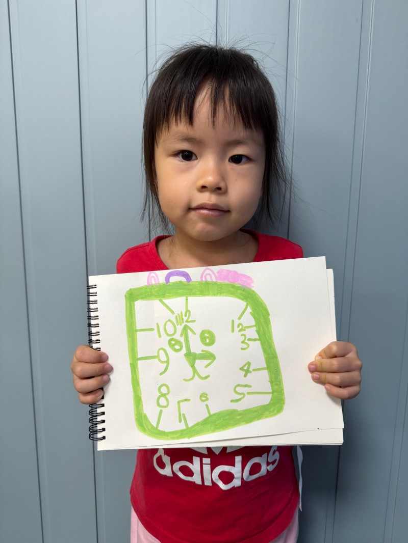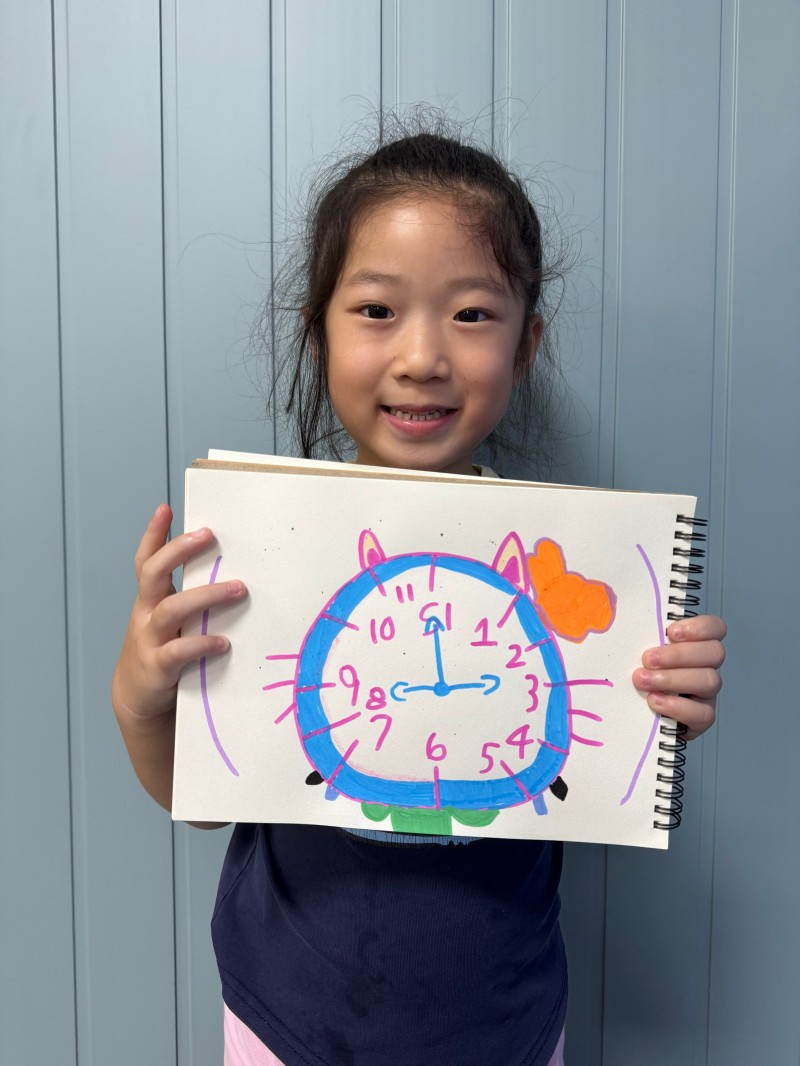 在对时钟的探究中,孩子们发现时钟的款式是多种多样的,设计专属时钟的想法瞬间点燃了大家的热情,孩子们握着彩笔尽情挥洒创意,有的将钟面画成星球的形状;有的画成卡通小动物的模样;还有的在时钟周围画上太阳、云朵和小花,让每一个时间刻度都充满生机。孩子们的奇思妙想,让一幅幅作品充满童趣。