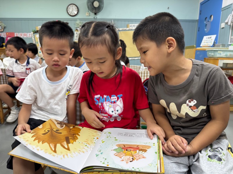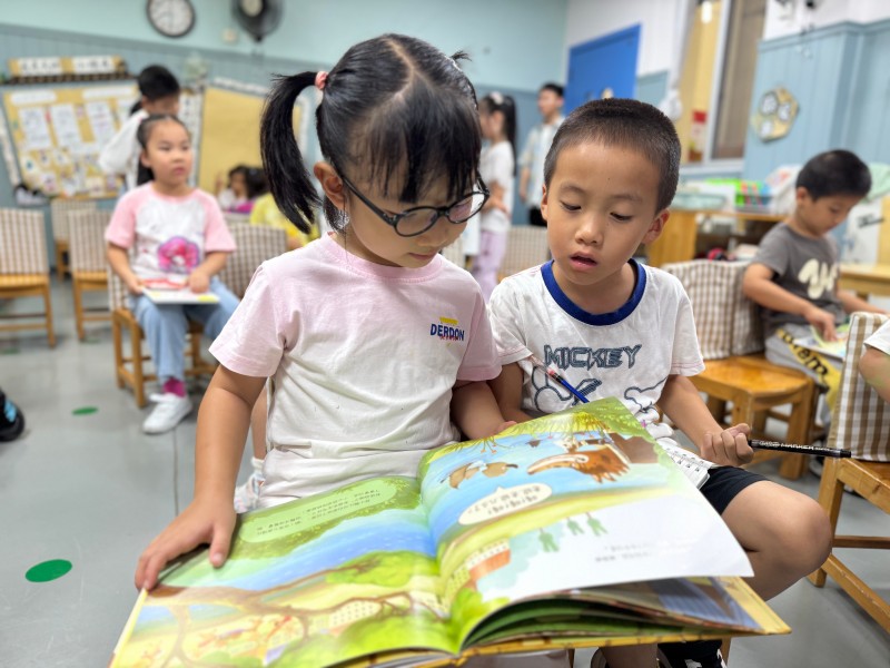 为了让大家从更多维度感受时间的意义,老师在语言区精心投放了《老狼老狼几点钟》、《时钟国王》、《鸭子叔叔的时钟》等关于时间的绘本,每天餐后都有孩子自发围坐在一起,捧着绘本静静阅读,有的还会小声和同伴交流故事里的情节。