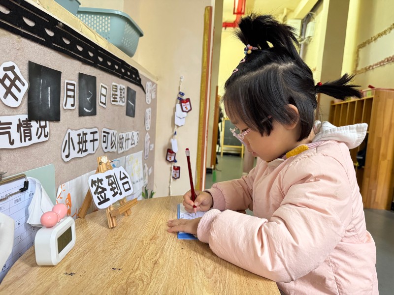 为了让时间管理能力真正落地,班级门口的“自主签到区”成了孩子们每天入园的“必修课”。找到自己的名字,写下到达的时间,按时签到的小朋友还能获得积分奖励。孩子们在签到打卡中,逐步养成不迟到、做事不拖沓的好习惯,时间意识不断增强。