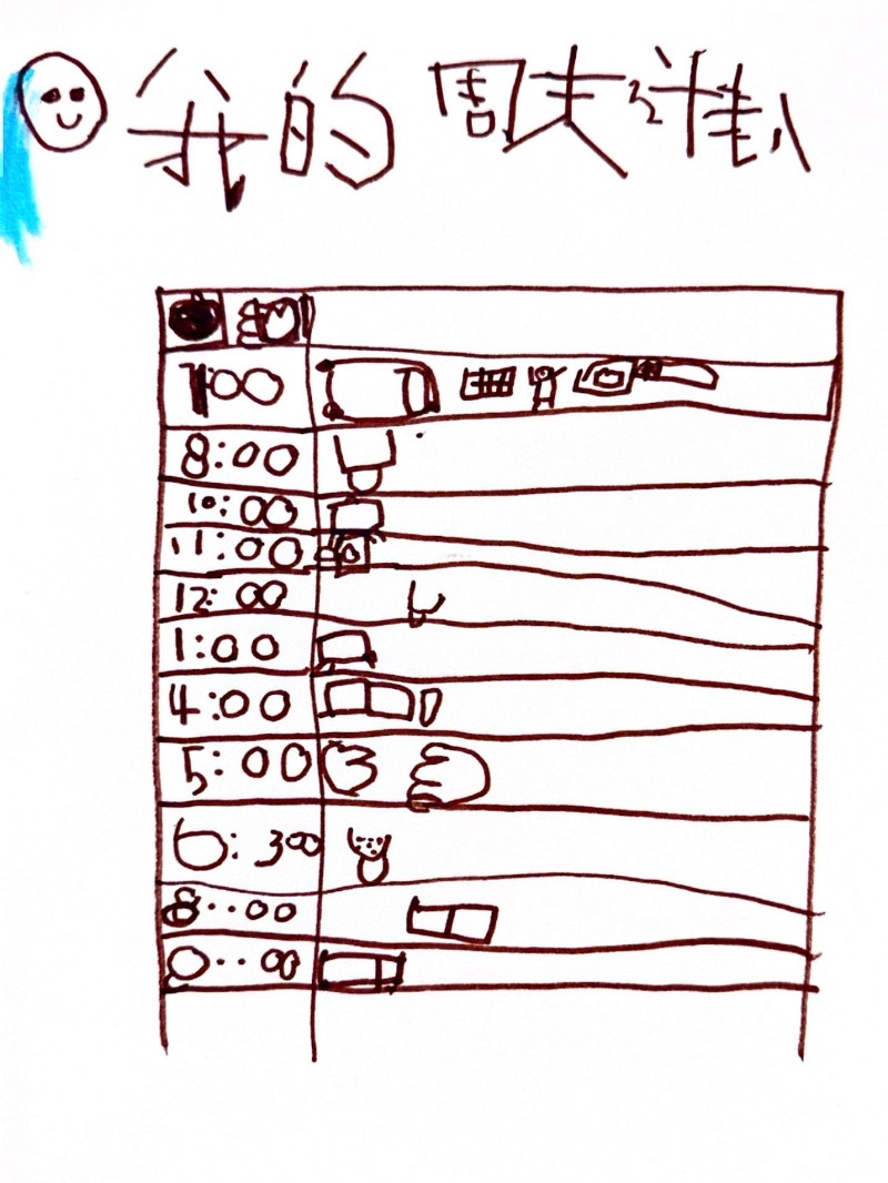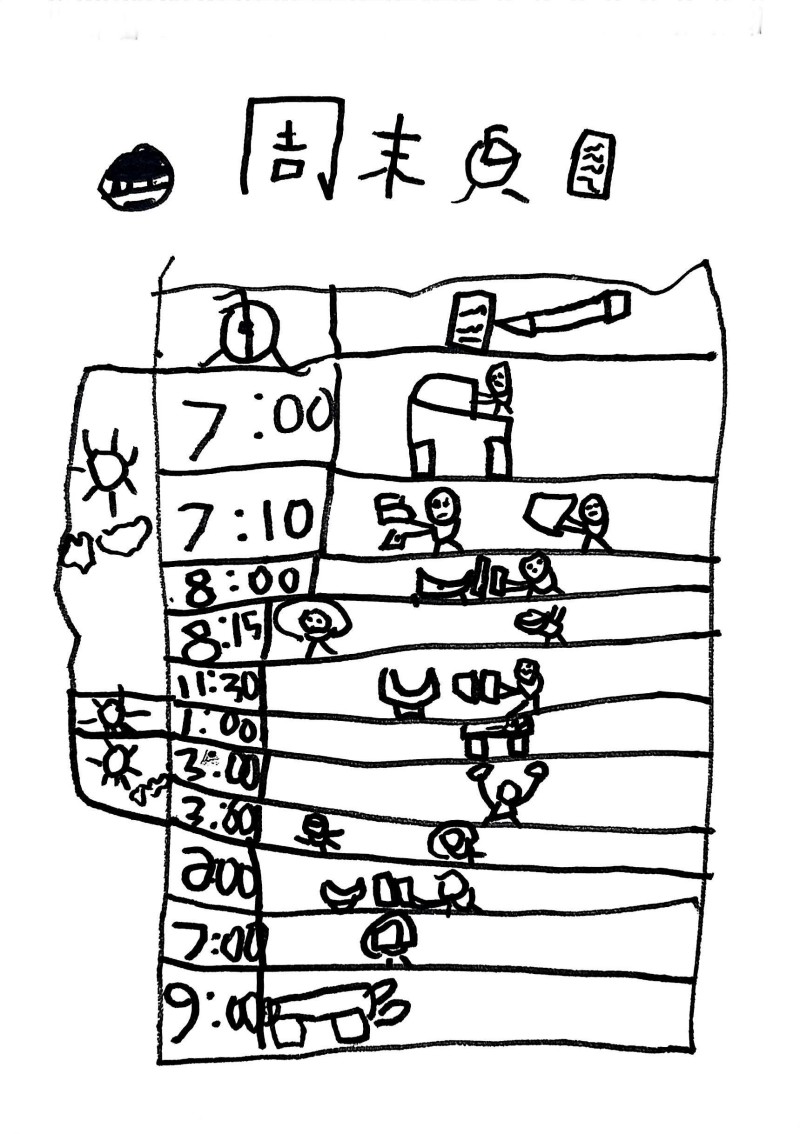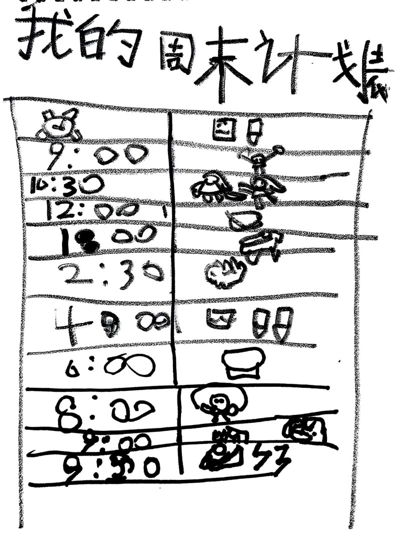 良好的生活作息能促进孩子们更好的成长。结合课间十分钟的规划经验,孩子们做起了小小规划师,通过绘画、图像表征等方式,设计《我的周末计划表》,尝试规划自己在周末时起床、游戏、吃饭、睡觉的时间。在一步步规划时间的过程中,逐步学会时间管理,成为时间的小主人。