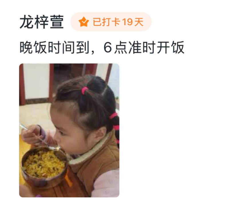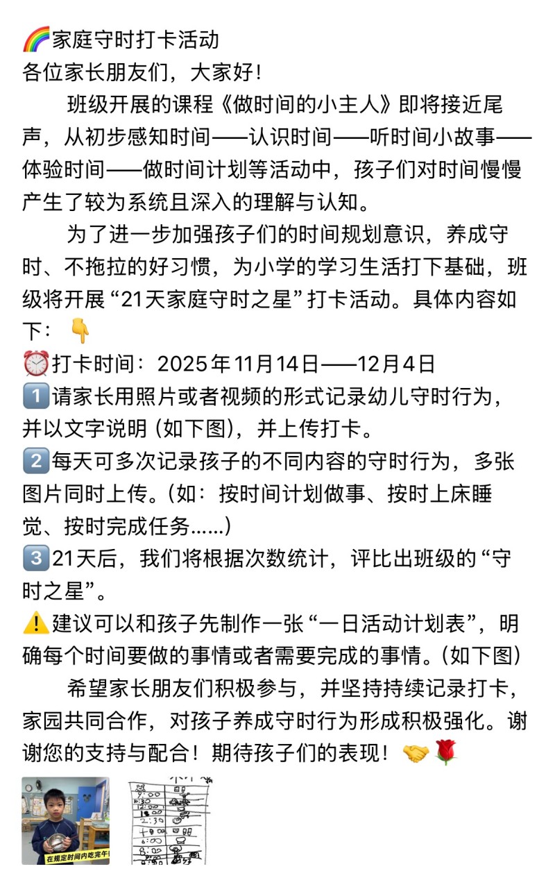 老师的话:《幼儿园教育指导纲要》明确指出“家庭是幼儿园重要的合作伙伴”,“家庭守时之星”打卡活动让教师对这句话有了更深刻的体悟。时间管理习惯的培养绝非幼儿园单方面的努力,必须依托家园协同才能真正落地。课程期间发起的打卡活动,正是搭建了这样一座共育桥梁。