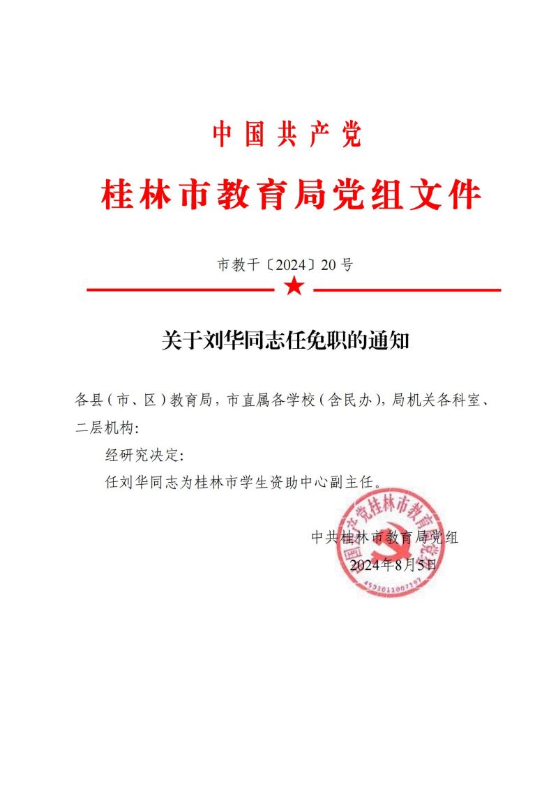 市教干〔2024〕20 号关于刘华同志任免职的通知
