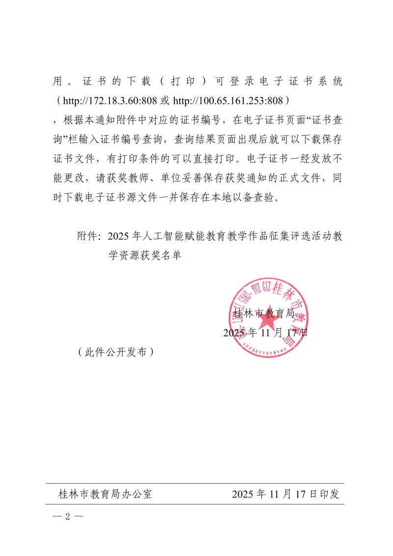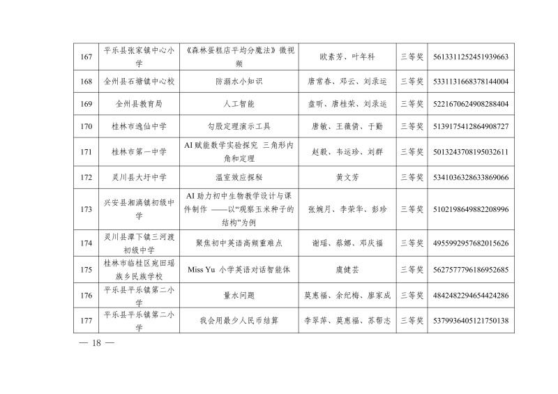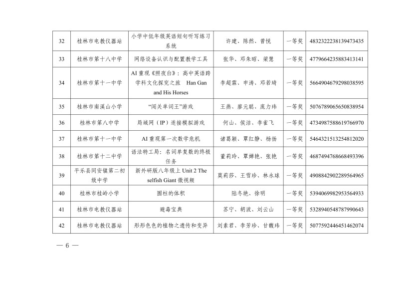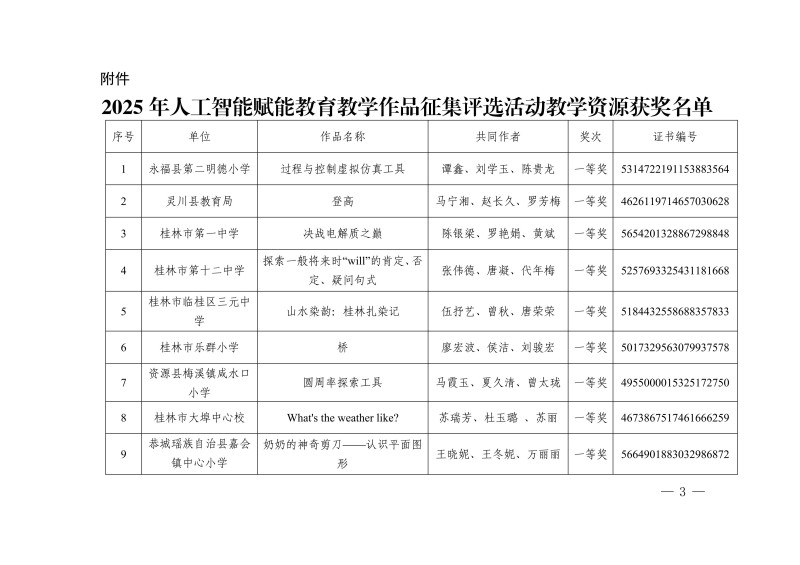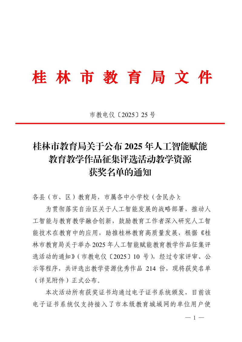 市教电仪〔2025〕25 号 桂林市教育局关于公布2025年人工智能赋能教育教学作品征集评选活动教学资源获奖名单的通知