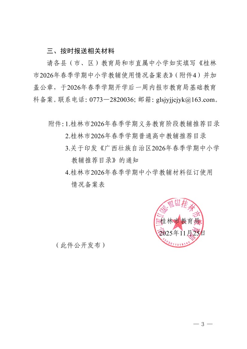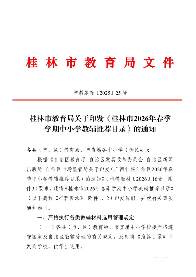 市教基教〔2025〕25 号桂林市教育局关于印发《桂林市2026年春季学期中小学教辅推荐目录》的通知