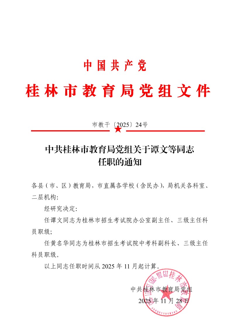 市教干〔2025〕24号 中共桂林市教育局党组关于谭文等同志任职的通知