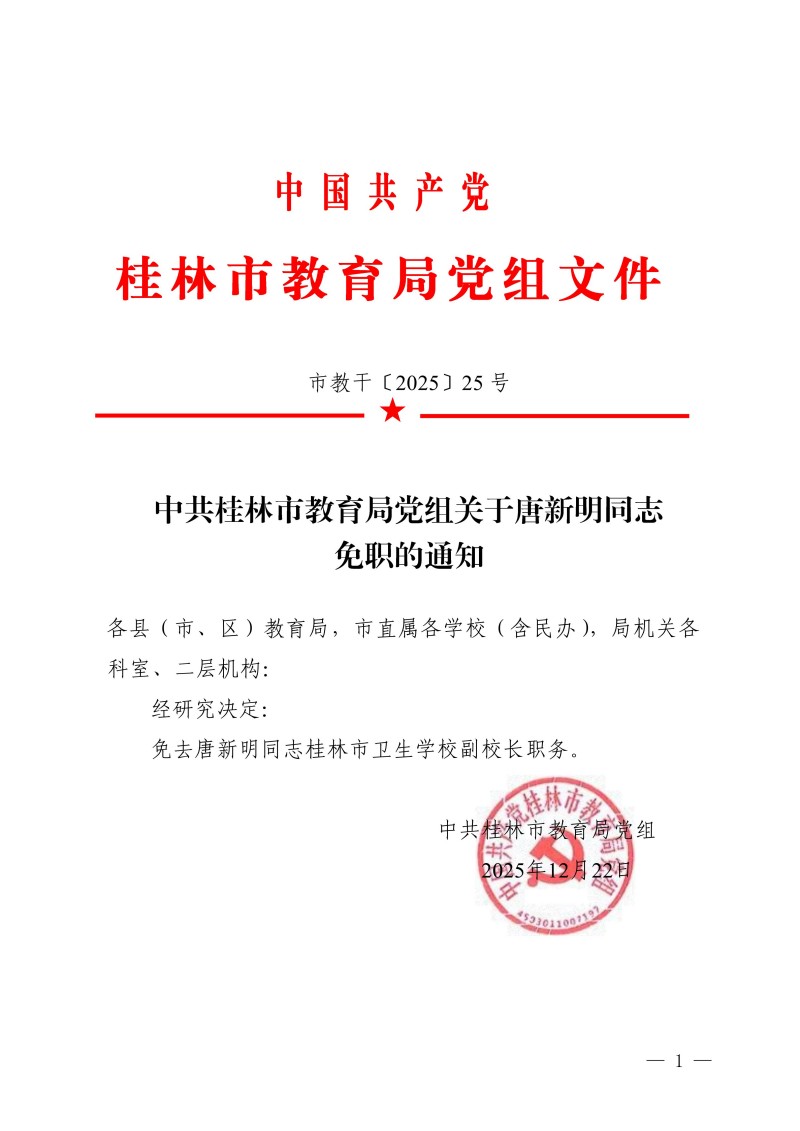 市教干〔2025〕25 号中共桂林市教育局党组关于唐新明同志免职的通知