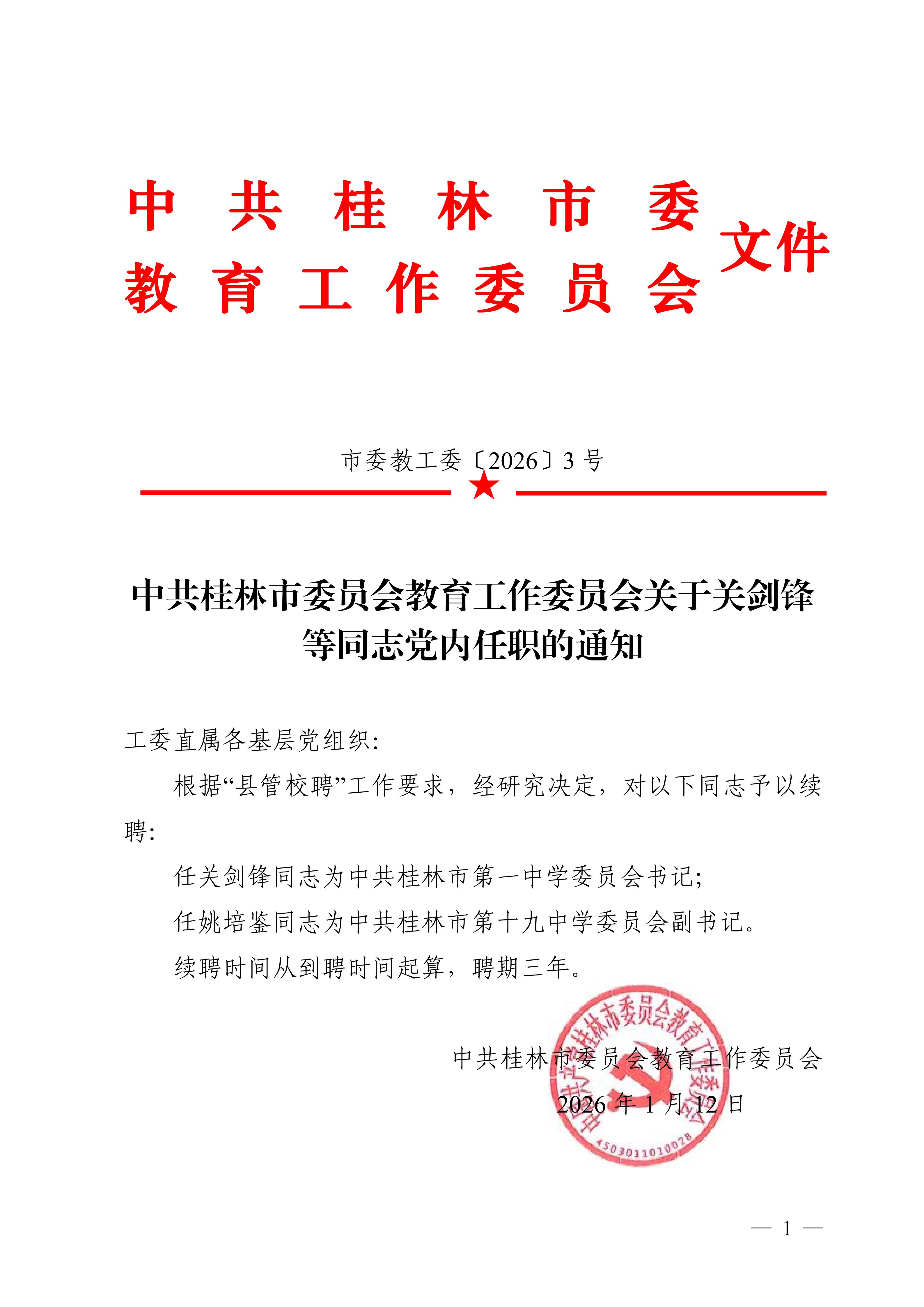 市委教工委〔2026〕3号中共桂林市委员会教育工作委员会关于关剑锋等同志党内任职的通知