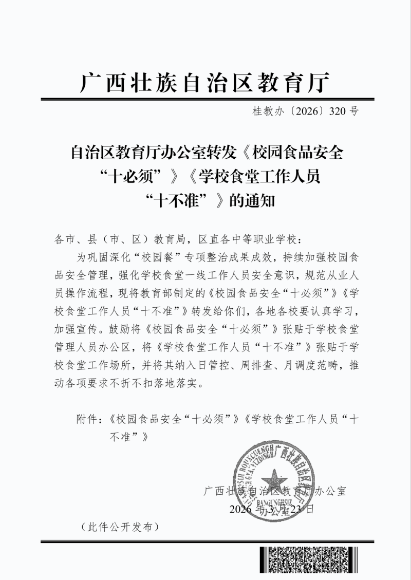 自治区教育厅办公室转发《校园食品安全 “十必须”》《学校食堂工作人员 “十不准”》的通知