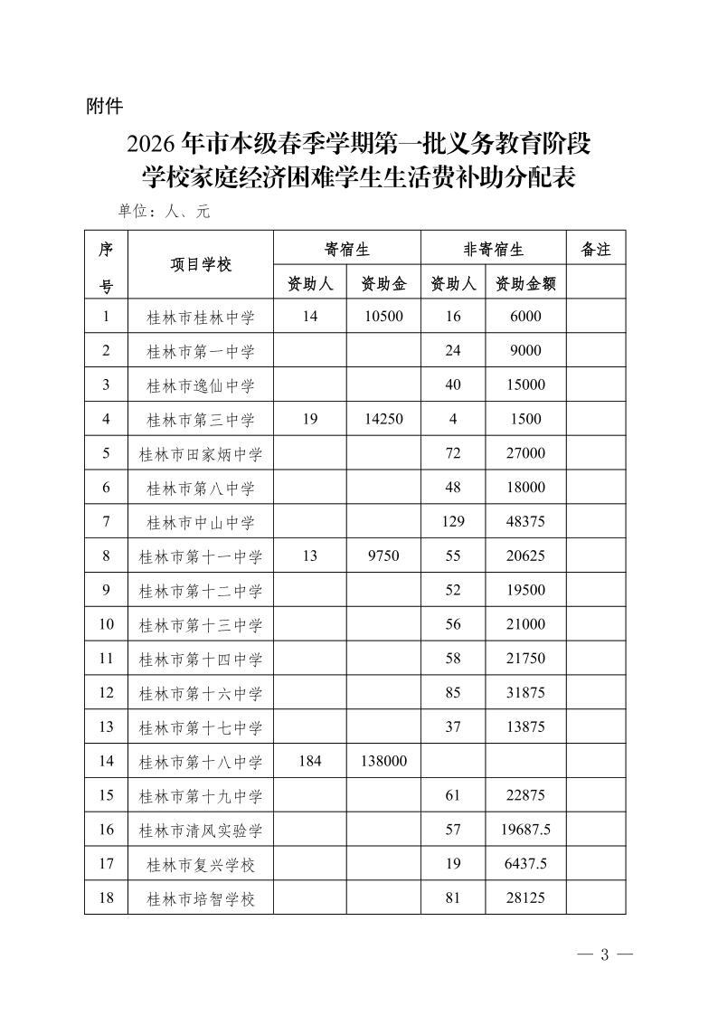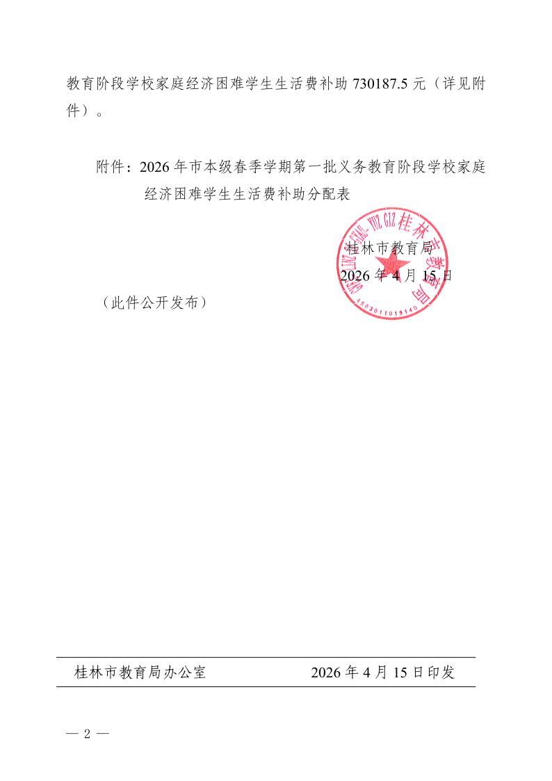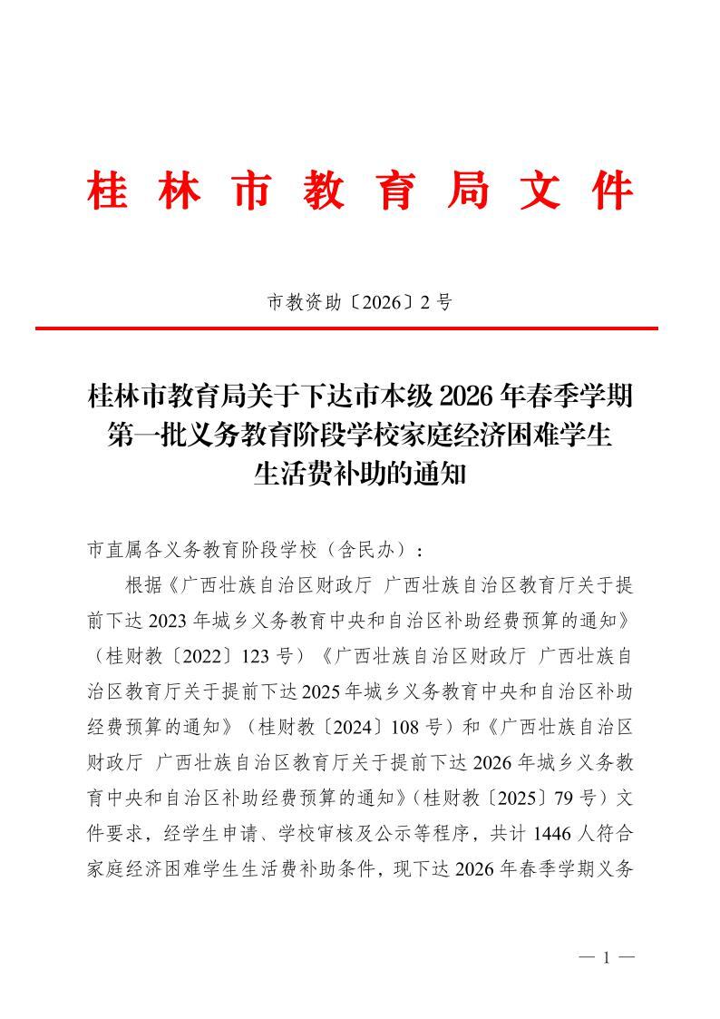市教资助〔2026〕2号桂林市教育局关于下达市本级2026年春季学期第一批义务教育阶段学校家庭经济困难学生生活费补助的通知