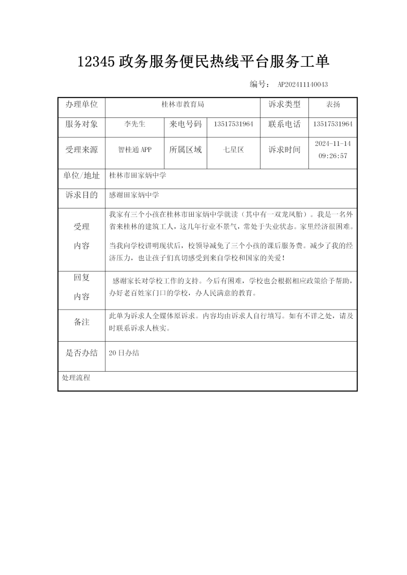 12345政务服务便民热线平台服务工单 编号: AP202411140043