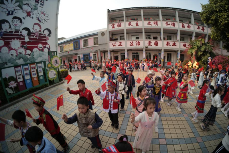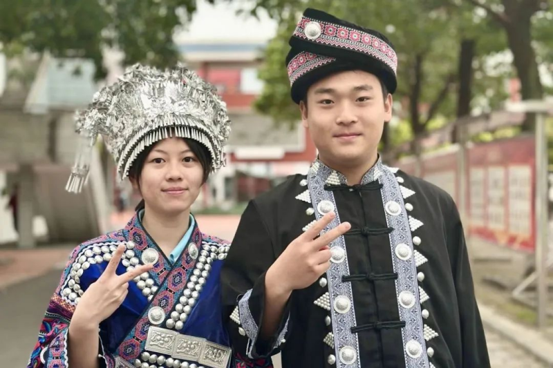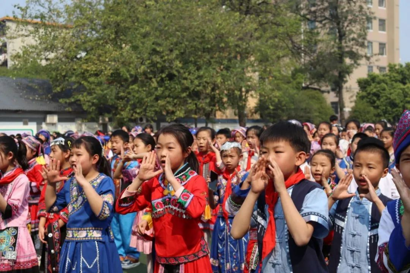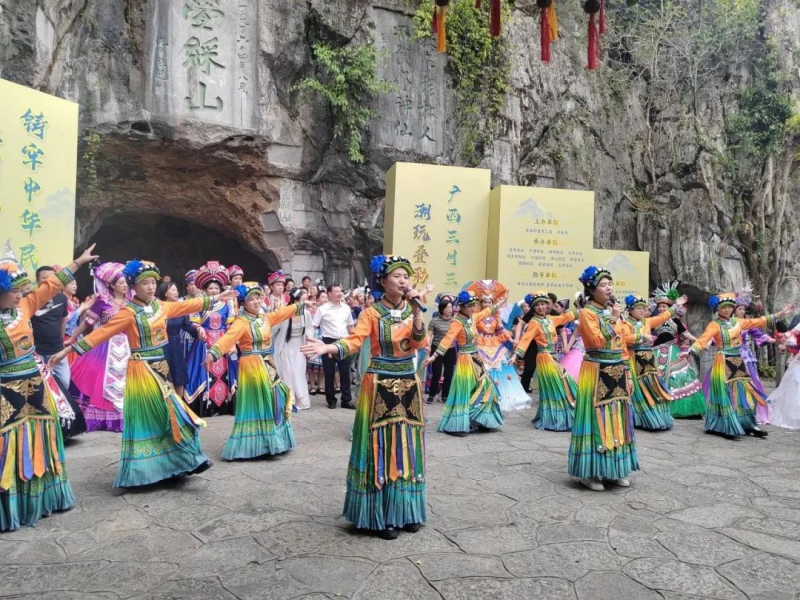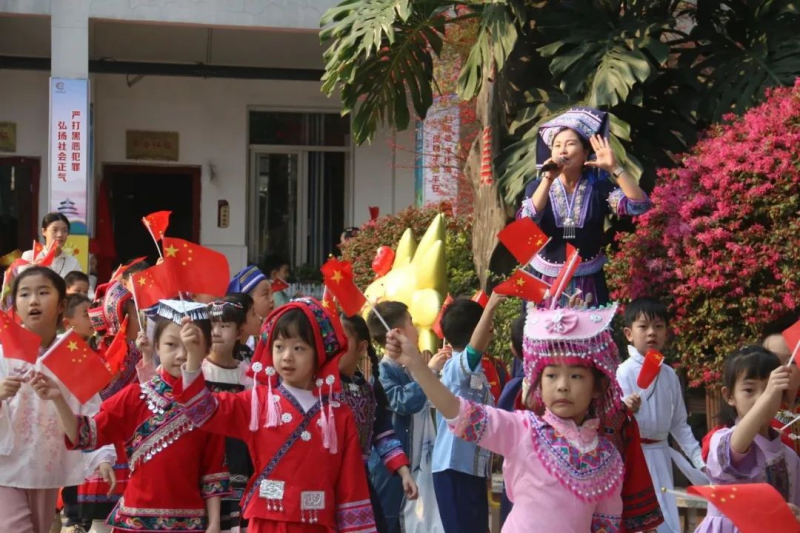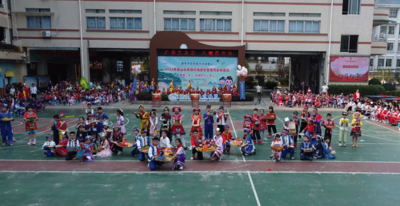 桂林市大风山一小师生身着民族服饰,通过歌舞展演、非遗体验等活动,展现“广西三月三”的节日魅力,描绘民族团结的生动图景。