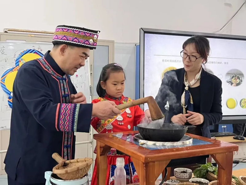 八桂嘉年华系列活动中,桂林市清风实验学校邀请恭城油茶非遗传承人现场展示油茶的制作技艺,师生共同参与体验。活动以美育实践为切入点,让民族文化在互动中焕发活力,成为一堂生动的民族团结教育课。