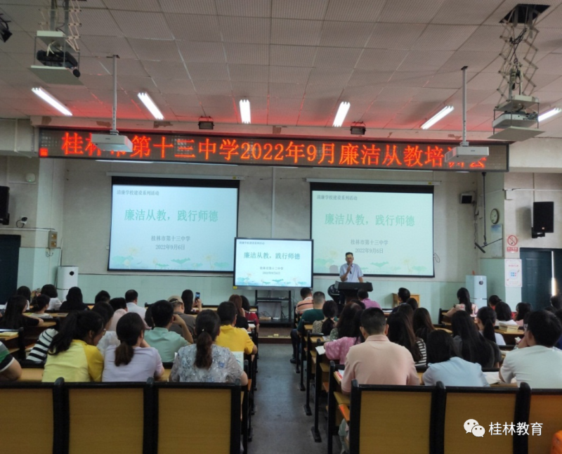 桂林市第十三中学自清廉学校创建以来,在教师、学生、家长群体中开展丰富多彩的活动,纵深推进清廉学校建设。学校通过警示教育、专题学习等活动,促进全体教师廉洁从教,立德树人;通过主题演讲、参观法治基地等,在学生心中深植崇清尚廉意识;通过家访、家长会等形式,不断提高家长的思想认识,为清廉学校建设提供强大助力。