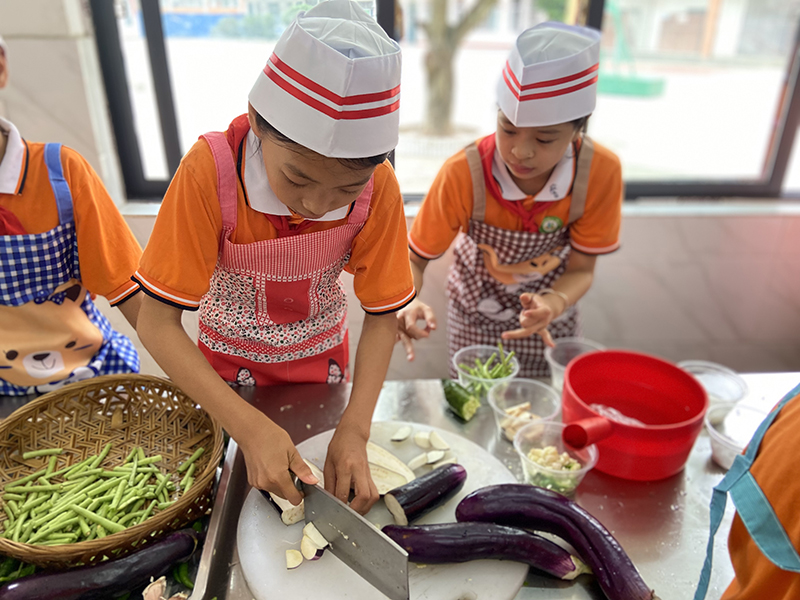 孩子们清洗完蔬菜,准备自己动手制作美食。切菜,放油,翻炒,加料,稚嫩的小手拿着锅铲,手法熟稔,俨然一副小厨师的模样,做菜的程序一样没落下,在孩子们的通力合作下,色香味俱全的菜便出锅了。从播种、栽苗、施肥、除草到开花结果,再到采摘、清洗、做菜,孩子们全程参与,看着这一盘劳动的果实,他们都急不可耐,忍不住开始品尝了起来。